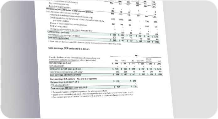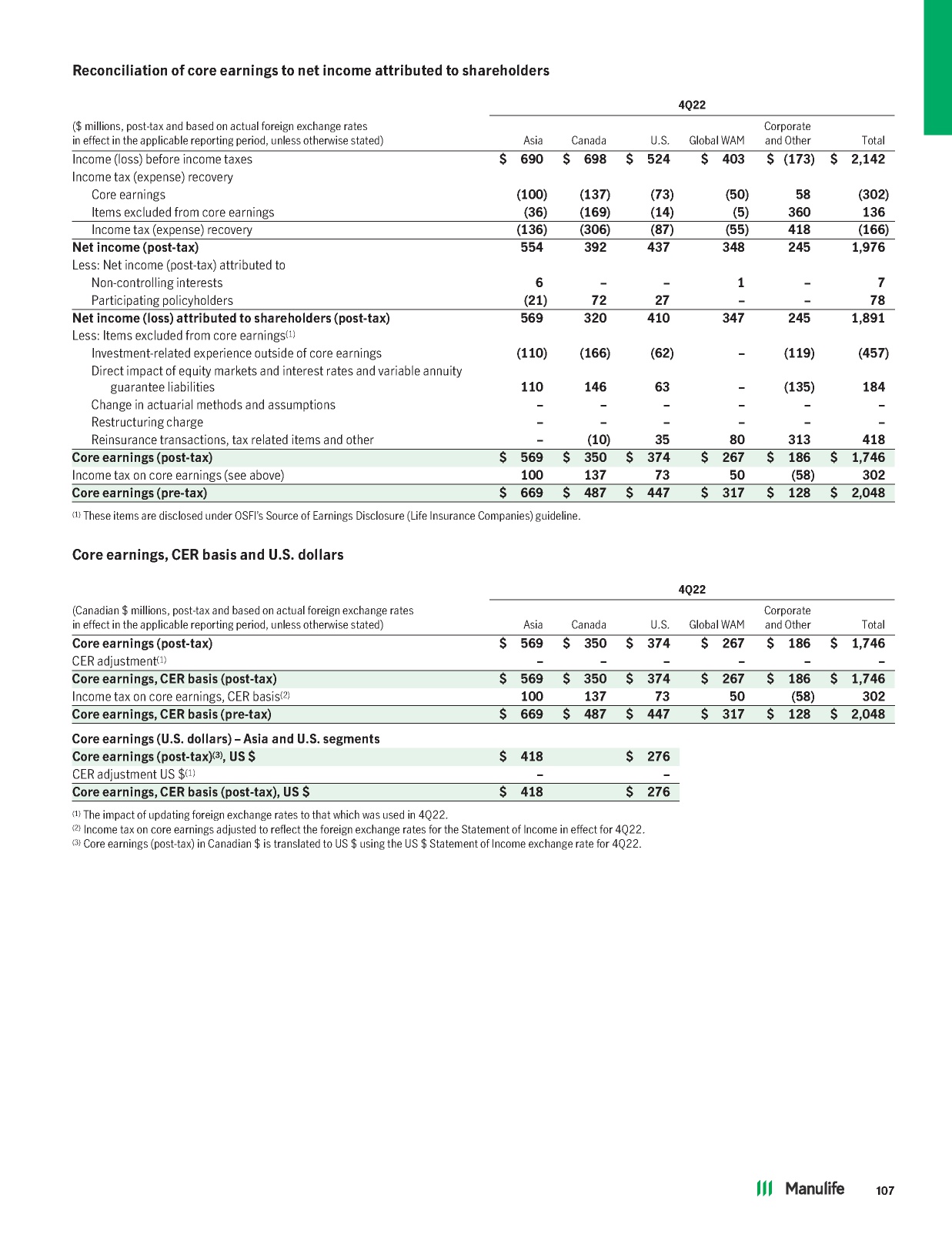 Reconciliationofcoreearningstonetincomeattributedtoshareholders 4Q22 ($ millions, post-tax and based on actual foreign exchange rates Corporate in effect in the applicable reporting period, unless otherwise stated) Asia Canada U.S. Global WAM and Other Total Income (loss) before income taxes $ 690 $ 698 $ 524 $ 403 $ (173) $ 2,142 Income tax (expense) recovery Core earnings (100) (137) (73) (50) 58 (302) Items excluded from core earnings (36) (169) (14) (5) 360 136 Income tax (expense) recovery (136) (306) (87) (55) 418 (166) Netincome(post-tax) 554 392 437 348 245 1,976 Less: Net income (post-tax) attributed to Non-controlling interests 6 – – 1 – 7 Participating policyholders (21) 72 27 – – 78 Netincome(loss)attributedtoshareholders(post-tax) 569 320 410 347 245 1,891 (1) Less: Items excluded from core earnings Investment-related experience outside of core earnings (110) (166) (62) – (119) (457) Direct impact of equity markets and interest rates and variable annuity guarantee liabilities 110 146 63 – (135) 184 Change in actuarial methods and assumptions – – – – – – Restructuring charge – – – – – – Reinsurance transactions, tax related items and other – (10) 35 80 313 418 Coreearnings(post-tax) $ 569 $ 350 $ 374 $ 267 $ 186 $ 1,746 Income tax on core earnings (see above) 100 137 73 50 (58) 302 Coreearnings(pre-tax) $ 669 $ 487 $ 447 $ 317 $ 128 $ 2,048 (1) These items are disclosed under OSFI’s Source of Earnings Disclosure (Life Insurance Companies) guideline. Coreearnings,CERbasisandU.S.dollars 4Q22 (Canadian $ millions, post-tax and based on actual foreign exchange rates Corporate in effect in the applicable reporting period, unless otherwise stated) Asia Canada U.S. Global WAM and Other Total Coreearnings(post-tax) $ 569 $ 350 $ 374 $ 267 $ 186 $ 1,746 (1) CER adjustment – – – – – – Coreearnings,CERbasis(post-tax) $ 569 $ 350 $ 374 $ 267 $ 186 $ 1,746 (2) Income tax on core earnings, CER basis 100 137 73 50 (58) 302 Coreearnings,CERbasis(pre-tax) $ 669 $ 487 $ 447 $ 317 $ 128 $ 2,048 Coreearnings(U.S.dollars)–AsiaandU.S.segments (3) Coreearnings(post-tax) ,US$ $ 418 $ 276 (1) CER adjustment US $ – – Coreearnings,CERbasis(post-tax),US$ $ 418 $ 276 (1) The impact of updating foreign exchange rates to that which was used in 4Q22. (2) Income tax on core earnings adjusted to reflect the foreign exchange rates for the Statement of Income in effect for 4Q22. (3) Core earnings (post-tax) in Canadian $ is translated to US $ using the US $ Statement of Income exchange rate for 4Q22. 107