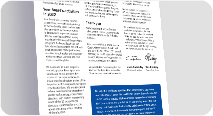 anchored always in our values. The against the 2017 baseline, and at the new Chair of the Board, which became past several years have brought many same time expanded our customer effective in February 2023, in tandem challenges, from an unpredictable base from 26 million to 34 million with my retirement from Manulife. It macroeconomic environment to an customers worldwide. These results has been my pleasure and privilege to unprecedented global pandemic and have been delivered thanks to the serve as a member of your Board for its many impacts. They have navigated efforts of our 40,000 colleagues the past 30 years and as Chairman for each of these challenges with around the globe, who have taken the past five. Reflecting on all we have characteristic energy and focus and accountability for meeting and accomplished in that time, I am very continued to drive resilient results. achieving our targets, year in and year proud of our team and deeply grateful out, and who together have built solid for the opportunity to represent you. We are also grateful to each of our foundations for future success. I’m honoured to have passed the gavel 40,000 winning team members at to Don, under whose leadership I know Manulife, whose commitment to our Your Board’s activities the Board, and indeed our Company, customers, our values, and to each in 2022 will continue to thrive. other remains an inspiration. Your Board has remained focused Thank you We would also like to thank you, on providing oversight and guidance our fellow shareholders, for your to the leadership team, and we were With that in mind, and as Don has trust, support, and candid feedback. also energized by the opportunity taken over in February, we wanted to While the past few years have been to incorporate in-person sessions offer some shared words of thanks challenging, the Company’s ability to into our meeting cadence, having in closing. deliver through such times is proof met virtually for most of the previous positive that we have the right strategy, two years. As hoped last year, our First, we would like to thank Joseph the right team, and the right to win. hybrid meeting schedule has not only Caron, whose term as director will enabled optimal participation from end as of the end of our 2023 annual our directors, but also enhanced our meeting, for his 12 years of dedicated ability to attract talented directors service. We very much appreciate his from around the globe. many contributions to Manulife. We continued to make progress We would also like to recognize Roy John Cassaday Don Lindsay towards greater diversity on your Gori and the Executive Leadership Chairman Emeritus Chair of the Board Board, and we are proud to have Team for their steadfast leadership, increased our representation of Asia-domiciled directors in view of the importance of the region to our future growth ambitions. We are also proud to have maintained our aspiration of On behalf of the Board and Manulife’s shareholders, customers, gender parity among independent and colleagues, I would like to offer our sincere thanks to John for directors, with women representing seven of the 11 independent his 30 years of service. We have marked many milestones during directors nominated for election that time, and we are grateful for his unwavering leadership and at our upcoming annual meeting many contributions to the Company. John’s sense of duty, grace, of shareholders. insight, and wisdom have served the Company well, and he will Reflecting these efforts, we were be missed. We wish him the very best in his future endeavours. pleased to be ranked in the top four Looking to the future, I appreciate the trust you have placed in me by the Globe and Mail’s Report on and I am humbled to serve as the Chair of your Board as we work Business Board Games rankings for together to achieve our bold ambition. board governance in Canada. We are also proud of our robust Don Lindsay succession planning, including the Chair of the Board appointment of Don Lindsay as your 3
