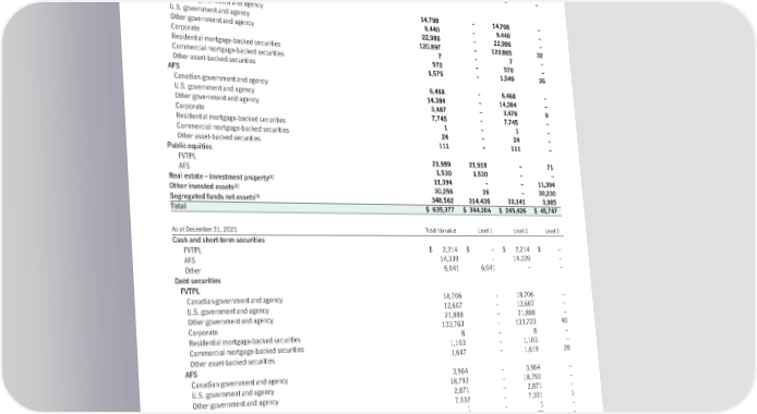 (g) Fair value measurement The following table presents the fair values of invested assets and segregated funds net assets measured at fair value categorized by the fair value hierarchy. As at December 31, 2022 Total fair value Level 1 Level 2 Level 3 Cash and short-term securities FVTPL $ 1,933 $ – $ 1,933 $ – AFS 10,926 – 10,926 – Other 6,294 6,294 – – Debt securities FVTPL Canadian government and agency 14,798 – 14,798 – U.S. government and agency 9,440 – 9,440 – Other government and agency 22,986 – 22,986 – Corporate 120,897 – 120,865 32 Residential mortgage-backed securities 7 – 7 – Commercial mortgage-backed securities 570 – 570 – Other asset-backed securities 1,575 – 1,549 26 AFS Canadian government and agency 6,468 – 6,468 – U.S. government and agency 14,384 – 14,384 – Other government and agency 3,487 – 3,478 9 Corporate 7,745 – 7,745 – Residential mortgage-backed securities 1 – 1 – Commercial mortgage-backed securities 24 – 24 – Other asset-backed securities 111 – 111 – Public equities FVTPL 21,989 21,918 – 71 AFS 1,530 1,530 – – (1) Real estate – investment property 11,394 – – 11,394 (2) Other invested assets 30,256 26 – 30,230 (3) Segregated funds net assets 348,562 314,436 30,141 3,985 Total $ 635,377 $ 344,204 $ 245,426 $ 45,747 As at December 31, 2021 Total fair value Level 1 Level 2 Level 3 Cash and short-term securities FVTPL $ 2,214 $ – $ 2,214 $ – AFS 14,339 – 14,339 – Other 6,041 6,041 – – Debt securities FVTPL Canadian government and agency 18,706 – 18,706 – U.S. government and agency 12,607 – 12,607 – Other government and agency 21,888 – 21,888 – Corporate 133,763 – 133,723 40 Residential mortgage-backed securities 8 – 8 – Commercial mortgage-backed securities 1,103 – 1,103 – Other asset-backed securities 1,647 – 1,619 28 AFS Canadian government and agency 3,964 – 3,964 – U.S. government and agency 18,792 – 18,792 – Other government and agency 2,871 – 2,871 – Corporate 7,332 – 7,331 1 Residential mortgage-backed securities 1 – 1 – Commercial mortgage-backed securities 79 – 79 – Other asset-backed securities 58 – 58 – Public equities FVTPL 25,716 25,716 – – AFS 2,351 2,349 2 – (1) Real estate – investment property 11,421 – – 11,421 (2) Other invested assets 24,300 257 – 24,043 (3) Segregated funds net assets 399,788 361,447 34,060 4,281 Total $ 708,989 $ 395,810 $ 273,365 $ 39,814 165
