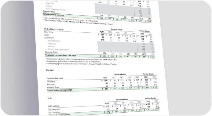 Segment core earnings by business line or geographic source ($ millions, post-tax and based on actual foreign exchange rates in effect in the applicable reporting period, unless otherwise stated) Asia QuarterlyResults Full YearResults (US $ millions) 4Q22 3Q22 2Q22 1Q22 4Q21 2022 2021 Hong Kong $ 224 $ 217 $ 216 $ 219 $ 270 $ 876 $ 949 Japan 84 89 84 77 77 334 323 (1) Asia Other 145 115 132 156 132 548 619 MainlandChina 16 96 Singapore 161 162 Vietnam 309 290 (2) OtherEmergingMarkets 62 71 Regional Office (35) (27) (31) (28) (44) (121) (155) TotalAsiacoreearnings $ 418 $ 394 $ 401 $ 424 $ 435 $ 1,637 $ 1,736 (1) Core earnings for Asia Other is reported by country annually, on a full year basis. (2) Other Emerging Markets includes Indonesia, the Philippines, Malaysia, Thailand, Cambodia and Myanmar. QuarterlyResults Full YearResults (1) (US $ millions), CER basis 4Q22 3Q22 2Q22 1Q22 4Q21 2022 2021 Hong Kong $ 224 $ 217 $ 216 $ 219 $ 270 $ 876 $ 949 Japan 84 87 78 63 62 312 251 (2) Asia Other 145 112 127 147 124 531 581 MainlandChina 14 87 Singapore 160 158 Vietnam 298 274 (3) OtherEmergingMarkets 59 62 Regional Office (35) (28) (31) (28) (44) (122) (155) TotalAsiacoreearnings,CERbasis $ 418 $ 388 $ 390 $ 401 $ 412 $ 1,597 $ 1,626 (1) Core earnings adjusted to reflect the foreign exchange rates for the Statement of Income in effect for 4Q22. (2) Core earnings for Asia Other is reported by country annually, on a full year basis. (3) Other Emerging Markets includes Indonesia, the Philippines, Malaysia, Thailand, Cambodia and Myanmar. Canada QuarterlyResults Full YearResults (Canadian $ millions) 4Q22 3Q22 2Q22 1Q22 4Q21 2022 2021 Insurance $ 240 $ 240 $ 233 $ 206 $ 184 $ 919 $ 770 Annuities 59 56 68 70 62 253 234 Manulife Bank 51 54 44 38 40 187 175 TotalCanadacoreearnings $ 350 $ 350 $ 345 $ 314 $ 286 $ 1,359 $ 1,179 U.S. QuarterlyResults Full YearResults (US $ millions) 4Q22 3Q22 2Q22 1Q22 4Q21 2022 2021 U.S. Insurance $ 235 $ 244 $ 316 $ 328 $ 274 $ 1,123 $ 1,128 U.S. Annuities 41 50 41 56 96 188 416 TotalU.S.coreearnings $ 276 $ 294 $ 357 $ 384 $ 370 $ 1,311 $ 1,544 112 | 2022AnnualReport | Management’sDiscussionandAnalysis