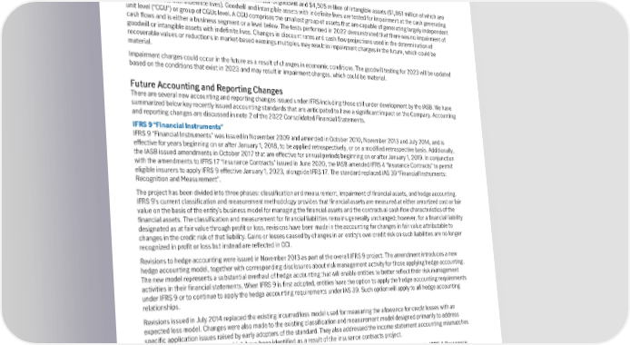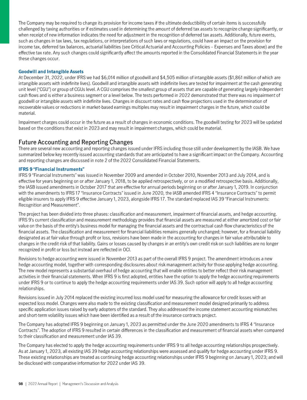 The Company may be required to change its provision for income taxes if the ultimate deductibility of certain items is successfully challenged by taxing authorities or if estimates used in determining the amount of deferred tax assets to recognize change significantly, or when receipt of new information indicates the need for adjustment in the recognition of deferred tax assets. Additionally, future events, such as changes in tax laws, tax regulations, or interpretations of such laws or regulations, could have an impact on the provision for income tax, deferred tax balances, actuarial liabilities (see Critical Actuarial and Accounting Policies – Expenses and Taxes above) and the effective tax rate. Any such changes could significantly affect the amounts reported in the Consolidated Financial Statements in the year these changes occur. GoodwillandIntangibleAssets At December 31, 2022, under IFRS we had $6,014 million of goodwill and $4,505 million of intangible assets ($1,861 million of which are intangible assets with indefinite lives). Goodwill and intangible assets with indefinite lives are tested for impairment at the cash generating unit level (“CGU”) or group of CGUs level. A CGU comprises the smallest group of assets that are capable of generating largely independent cash flows and is either a business segment or a level below. The tests performed in 2022 demonstrated that there was no impairment of goodwill or intangible assets with indefinite lives. Changes in discount rates and cash flow projections used in the determination of recoverable values or reductions in market-based earnings multiples may result in impairment charges in the future, which could be material. Impairment charges could occur in the future as a result of changes in economic conditions. The goodwill testing for 2023 will be updated based on the conditions that exist in 2023 and may result in impairment charges, which could be material. Future Accounting and Reporting Changes There are several new accounting and reporting changes issued under IFRS including those still under development by the IASB. We have summarized below key recently issued accounting standards that are anticipated to have a significant impact on the Company. Accounting and reporting changes are discussed in note 2 of the 2022 Consolidated Financial Statements. IFRS9“FinancialInstruments” IFRS 9 “Financial Instruments” was issued in November 2009 and amended in October 2010, November 2013 and July 2014, and is effective for years beginning on or after January 1, 2018, to be applied retrospectively, or on a modified retrospective basis. Additionally, the IASB issued amendments in October 2017 that are effective for annual periods beginning on or after January 1, 2019. In conjunction with the amendments to IFRS 17 “Insurance Contracts” issued in June 2020, the IASB amended IFRS 4 “Insurance Contracts” to permit eligible insurers to apply IFRS 9 effective January 1, 2023, alongside IFRS 17. The standard replaced IAS 39 “Financial Instruments: Recognition and Measurement”. The project has been divided into three phases: classification and measurement, impairment of financial assets, and hedge accounting. IFRS 9’s current classification and measurement methodology provides that financial assets are measured at either amortized cost or fair value on the basis of the entity’s business model for managing the financial assets and the contractual cash flow characteristics of the financial assets. The classification and measurement for financial liabilities remains generally unchanged; however, for a financial liability designated as at fair value through profit or loss, revisions have been made in the accounting for changes in fair value attributable to changes in the credit risk of that liability. Gains or losses caused by changes in an entity’s own credit risk on such liabilities are no longer recognized in profit or loss but instead are reflected in OCI. Revisions to hedge accounting were issued in November 2013 as part of the overall IFRS 9 project. The amendment introduces a new hedge accounting model, together with corresponding disclosures about risk management activity for those applying hedge accounting. The new model represents a substantial overhaul of hedge accounting that will enable entities to better reflect their risk management activities in their financial statements. When IFRS 9 is first adopted, entities have the option to apply the hedge accounting requirements under IFRS 9 or to continue to apply the hedge accounting requirements under IAS 39. Such option will apply to all hedge accounting relationships. Revisions issued in July 2014 replaced the existing incurred loss model used for measuring the allowance for credit losses with an expected loss model. Changes were also made to the existing classification and measurement model designed primarily to address specific application issues raised by early adopters of the standard. They also addressed the income statement accounting mismatches and short-term volatility issues which have been identified as a result of the insurance contracts project. The Company has adopted IFRS 9 beginning on January 1, 2023 as permitted under the June 2020 amendments to IFRS 4 “Insurance Contracts”. The adoption of IFRS 9 resulted in certain differences in the classification and measurement of financial assets when compared to their classification and measurement under IAS 39. The Company has elected to apply the hedge accounting requirements under IFRS 9 to all hedge accounting relationships prospectively. As at January 1, 2023, all existing IAS 39 hedge accounting relationships were assessed and qualify for hedge accounting under IFRS 9. These existing relationships are treated as continuing hedge accounting relationships under IFRS 9 beginning on January 1, 2023; and will be disclosed with comparative information for 2022 under IAS 39. 98 | 2022AnnualReport | Ma