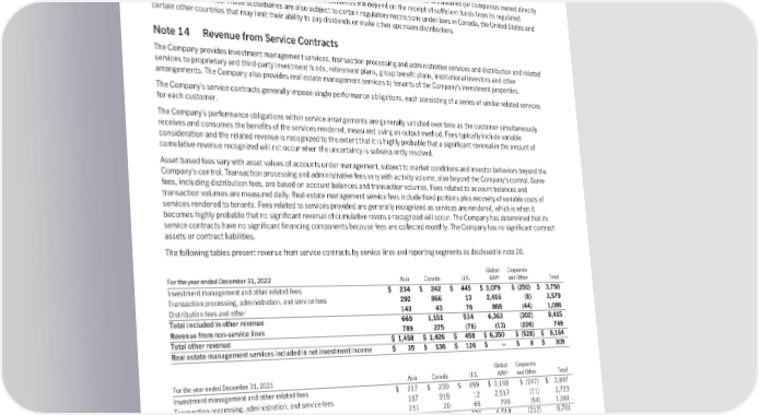 by OSFI. The ICA also requires an insurance company to notify OSFI of the declaration of a dividend at least 15 days prior to the date fixed for its payment. Similarly, the ICA prohibits the purchase for cancellation of any shares issued by an insurance company or the redemption of any redeemable shares or other similar capital transactions, if there are reasonable grounds for believing that the company does not have adequate capital and adequate and appropriate forms of liquidity or the payment would cause the company to be in contravention of any regulation made under the ICA respecting the maintenance of adequate capital and adequate and appropriate forms of liquidity, or any direction made to the company by OSFI. These latter transactions would require the prior approval of OSFI. The ICA requires Canadian insurance companies to maintain adequate levels of capital at all times. Since MFC is a holding company that conducts all of its operations through regulated insurance subsidiaries (or companies owned directly or indirectly by these subsidiaries), its ability to pay future dividends will depend on the receipt of sufficient funds from its regulated insurance subsidiaries. These subsidiaries are also subject to certain regulatory restrictions under laws in Canada, the United States and certain other countries that may limit their ability to pay dividends or make other upstream distributions. Note 14 Revenue from Service Contracts The Company provides investment management services, transaction processing and administrative services and distribution and related services to proprietary and third-party investment funds, retirement plans, group benefit plans, institutional investors and other arrangements. The Company also provides real estate management services to tenants of the Company’s investment properties. The Company’s service contracts generally impose single performance obligations, each consisting of a series of similar related services for each customer. The Company’s performance obligations within service arrangements are generally satisfied over time as the customer simultaneously receives and consumes the benefits of the services rendered, measured using an output method. Fees typically include variable consideration and the related revenue is recognized to the extent that it is highly probable that a significant reversal in the amount of cumulative revenue recognized will not occur when the uncertainty is subsequently resolved. Asset based fees vary with asset values of accounts under management, subject to market conditions and investor behaviors beyond the Company’s control. Transaction processing and administrative fees vary with activity volume, also beyond the Company’s control. Some fees, including distribution fees, are based on account balances and transaction volumes. Fees related to account balances and transaction volumes are measured daily. Real estate management service fees include fixed portions plus recovery of variable costs of services rendered to tenants. Fees related to services provided are generally recognized as services are rendered, which is when it becomes highly probable that no significant reversal of cumulative revenue recognized will occur. The Company has determined that its service contracts have no significant financing components because fees are collected monthly. The Company has no significant contract assets or contract liabilities. The following tables present revenue from service contracts by service lines and reporting segments as disclosed in note 20. Global Corporate For the year ended December 31, 2022 Asia Canada U.S. WAM and Other Total Investment management and other related fees $ 234 $ 242 $ 445 $ 3,079 $ (250) $ 3,750 Transaction processing, administration, and service fees 292 866 13 2,416 (8) 3,579 Distribution fees and other 143 43 76 868 (44) 1,086 Total included in other revenue 669 1,151 534 6,363 (302) 8,415 Revenue from non-service lines 789 275 (76) (13) (226) 749 Total other revenue $ 1,458 $ 1,426 $ 458 $ 6,350 $ (528) $ 9,164 Real estate management services included in net investment income $ 35 $ 136 $ 126 $ – $ 8 $ 305 Global Corporate For the year ended December 31, 2021 Asia Canada U.S. WAM and Other Total Investment management and other related fees $ 217 $ 230 $ 499 $ 3,198 $ (247) $ 3,897 Transaction processing, administration, and service fees 287 918 12 2,517 (11) 3,723 Distribution fees and other 251 20 65 799 (54) 1,081 Total included in other revenue 755 1,168 576 6,514 (312) 8,701 Revenue from non-service lines 941 168 1,248 (1) 75 2,431 Total other revenue $ 1,696 $ 1,336 $ 1,824 $ 6,513 $ (237) $ 11,132 Real estate management services included in net investment income $ 37 $ 126 $ 128 $ – $ 7 $ 298 198 | 2022AnnualReport | NotestoConsolidatedFinancialStatements