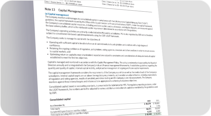 (d) Quarterlydividenddeclarationsubsequenttoyearend On February 15, 2023, the Company’s Board of Directors approved a quarterly dividend of $0.365 per share on the common shares of MFC, payable on or after March 20, 2023 to shareholders of record at the close of business on February 28, 2023. The Board also declared dividends on the following non-cumulative preferred shares, payable on or after March 19, 2023 to shareholders of record at the close of business on February 28, 2023. Class A Shares Series 2 – $0.29063 per share Class 1 Shares Series 13 – $0.275875 per share Class A Shares Series 3 – $0.28125 per share Class 1 Shares Series 15 – $0.236625 per share Class 1 Shares Series 3 – $0.14675 per share Class 1 Shares Series 17 – $0.2375 per share Class 1 Shares Series 4 – $0.34089 per share Class 1 Shares Series 19 – $0.229688 per share Class 1 Shares Series 9 – $0.373625 per share Class 1 Shares Series 25 – $0.29375 per share Class 1 Shares Series 11 – $0.295688 per share Note 13 Capital Management (a) Capitalmanagement The Company monitors and manages its consolidated capital in compliance with the Life Insurance Capital Adequacy Test (“LICAT”) guideline, the capital framework issued by the Office of the Superintendent of Financial Institutions (“OSFI”). Under the capital framework, the Company’s consolidated capital resources, including available capital, surplus allowance, and eligible deposits, are measured against the base solvency buffer, which is the risk-based capital requirement determined in accordance with the guideline. The Company’s operating activities are primarily conducted within MLI and its subsidiaries. MLI is also regulated by OSFI and is therefore subject to consolidated risk-based capital requirements using the OSFI LICAT framework. The Company seeks to manage its capital with the objectives of: • Operating with sufficient capital to be able to honour all commitments to its policyholders and creditors with a high degree of confidence; • Retaining the ongoing confidence of regulators, policyholders, rating agencies, investors and other creditors in order to ensure access to capital markets; and • Optimizing return on capital to meet shareholders’ expectations subject to constraints and considerations of adequate levels of capital established to meet the first two objectives. Capital is managed and monitored in accordance with the Capital Management Policy. The policy is reviewed and approved by the Board of Directors annually and is integrated with the Company’s risk and financial management frameworks. It establishes guidelines regarding the quantity and quality of capital, internal capital mobility, and proactive management of ongoing and future capital requirements. The capital management framework considers the requirements of the Company as a whole as well as the needs of each of the Company’s subsidiaries. Internal capital targets are set above the regulatory requirements, and consider a number of factors, including expectations of regulators and rating agencies, results of sensitivity and stress testing and the Company’s own risk assessments. The Company monitors against these internal targets and initiates actions appropriate to achieving its business objectives. Consolidated capital, based on accounting standards, is presented in the table below for MFC. For regulatory reporting purposes, under the LICAT framework, the numbers are further adjusted for various additions or deductions to capital as mandated by the guidelines used by OSFI. Consolidatedcapital As at December 31, 2022 2021 Total equity $ 56,379 $ 58,869 Exclude AOCI gain/(loss) on cash flow hedges 8 (156) Total equity excluding AOCI on cash flow hedges 56,371 59,025 Qualifying capital instruments 6,122 6,980 Consolidated capital $ 62,493 $ 66,005 (b) Restrictionsondividendsandcapitaldistributions Dividends and capital distributions are restricted under the Insurance Companies Act (“ICA”). These restrictions apply to both MFC and its primary operating subsidiary MLI. The ICA prohibits the declaration or payment of any dividend on shares of an insurance company if there are reasonable grounds for believing a company does not have adequate capital and adequate and appropriate forms of liquidity or the declaration or the payment of the dividend would cause the company to be in contravention of any regulation made under the ICA respecting the maintenance of adequate capital and adequate and appropriate forms of liquidity, or of any direction made to the company 197