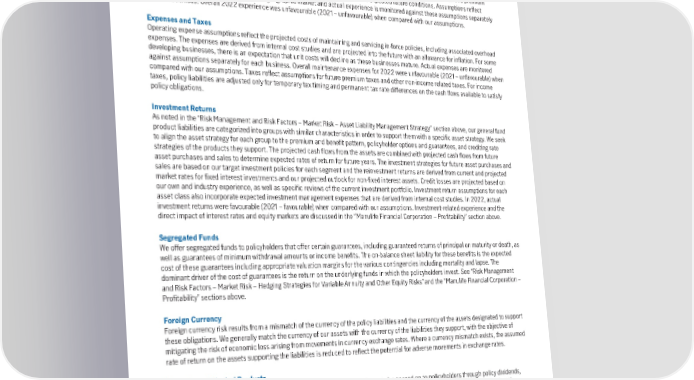assumptions separately for each business. Our morbidity risk exposure relates to future expected claims costs for long-term care insurance, as well as for group benefits and certain individual health insurance products we offer. Overall 2022 experience was favourable (2021 – favourable) when compared with our assumptions. PolicyTerminationandPremiumPersistency Policy termination includes lapses and surrenders, where lapses represent the termination of policies due to non-payment of premiums and surrenders represent the voluntary termination of policies by policyholders. Premium persistency represents the level of ongoing deposits on contracts where there is policyholder discretion as to the amount and timing of deposits. Policy termination and premium persistency assumptions are primarily based on our recent experience adjusted for expected future conditions. Assumptions reflect differences by type of contract within each geographic market and actual experience is monitored against these assumptions separately for each business. Overall 2022 experience was unfavourable (2021 – unfavourable) when compared with our assumptions. ExpensesandTaxes Operating expense assumptions reflect the projected costs of maintaining and servicing in-force policies, including associated overhead expenses. The expenses are derived from internal cost studies and are projected into the future with an allowance for inflation. For some developing businesses, there is an expectation that unit costs will decline as these businesses mature. Actual expenses are monitored against assumptions separately for each business. Overall maintenance expenses for 2022 were unfavourable (2021 – unfavourable) when compared with our assumptions. Taxes reflect assumptions for future premium taxes and other non-income related taxes. For income taxes, policy liabilities are adjusted only for temporary tax timing and permanent tax rate differences on the cash flows available to satisfy policy obligations. InvestmentReturns As noted in the “Risk Management and Risk Factors – Market Risk – Asset Liability Management Strategy” section above, our general fund product liabilities are categorized into groups with similar characteristics in order to support them with a specific asset strategy. We seek to align the asset strategy for each group to the premium and benefit pattern, policyholder options and guarantees, and crediting rate strategies of the products they support. The projected cash flows from the assets are combined with projected cash flows from future asset purchases and sales to determine expected rates of return for future years. The investment strategies for future asset purchases and sales are based on our target investment policies for each segment and the reinvestment returns are derived from current and projected market rates for fixed interest investments and our projected outlook for non-fixed interest assets. Credit losses are projected based on our own and industry experience, as well as specific reviews of the current investment portfolio. Investment return assumptions for each asset class also incorporate expected investment management expenses that are derived from internal cost studies. In 2022, actual investment returns were favourable (2021 – favourable) when compared with our assumptions. Investment-related experience and the direct impact of interest rates and equity markets are discussed in the “Manulife Financial Corporation – Profitability” section above. SegregatedFunds We offer segregated funds to policyholders that offer certain guarantees, including guaranteed returns of principal on maturity or death, as well as guarantees of minimum withdrawal amounts or income benefits. The on-balance sheet liability for these benefits is the expected cost of these guarantees including appropriate valuation margins for the various contingencies including mortality and lapse. The dominant driver of the cost of guarantees is the return on the underlying funds in which the policyholders invest. See “Risk Management and Risk Factors – Market Risk – Hedging Strategies for Variable Annuity and Other Equity Risks”and the “Manulife Financial Corporation – Profitability” sections above. ForeignCurrency Foreign currency risk results from a mismatch of the currency of the policy liabilities and the currency of the assets designated to support these obligations. We generally match the currency of our assets with the currency of the liabilities they support, with the objective of mitigating the risk of economic loss arising from movements in currency exchange rates. Where a currency mismatch exists, the assumed rate of return on the assets supporting the liabilities is reduced to reflect the potential for adverse movements in exchange rates. ExperienceAdjustedProducts Where policies have features that allow the impact of changes in experience to be passed on to policyholders through policy dividends, experience rating refunds, credited rates or other adjustable features, the projected policyholder benefits are adjusted to reflect the projected experience. Minimum contractual guarantees and other market considerations are taken into account in determining the policy adjustments. ProvisionforAdverseDeviation The total provision for adverse deviation is the sum of the provisions for adverse deviation for each risk factor. Margins for adverse deviation are established by product type and geographic market for each assumption or factor used in the determination of the best estimate actuarial liability. The margins are established based on the risk characteristics of the business being valued. 89