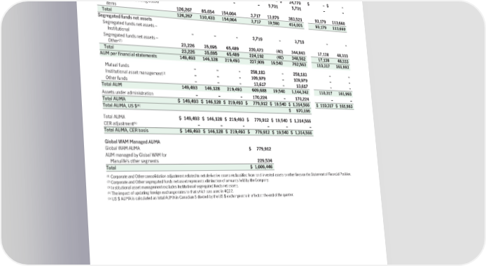 AUM and AUMA reconciliations (Canadian $ in millions, and based on actual foreign exchange rates in effect in the applicable reporting period, unless otherwise stated) CAD $ US $(4) December31,2022 December31,2022 Global Corporate As at Asia Canada U.S. WAM and Other Total Asia U.S. Total Invested Assets Manulife Bank net lending assets $ – $ 24,779 $ – $ – $ – $ 24,779 $ – $ – (1) Derivative reclassification – – – – 5,701 5,701 – – Invested assets excluding above items 126,267 85,654 154,004 3,717 13,879 383,521 93,179 113,660 Total 126,267 110,433 154,004 3,717 19,580 414,001 93,179 113,660 Segregated funds net assets Segregated funds net assets – Institutional – – – 3,719 – 3,719 – – Segregated funds net assets – (2) Other 23,226 35,695 65,489 220,473 (40) 344,843 17,138 48,333 Total 23,226 35,695 65,489 224,192 (40) 348,562 17,138 48,333 AUM per financial statements 149,493 146,128 219,493 227,909 19,540 762,563 110,317 161,993 Mutual funds – – – 258,183 – 258,183 – – (3) Institutional asset management – – – 109,979 – 109,979 – – Other funds – – – 13,617 – 13,617 – – Total AUM 149,493 146,128 219,493 609,688 19,540 1,144,342 110,317 161,993 Assets under administration – – – 170,224 – 170,224 – – Total AUMA $ 149,493 $ 146,128 $ 219,493 $ 779,912 $ 19,540 $ 1,314,566 $ 110,317 $ 161,993 (4) Total AUMA, US $ $ 970,196 Total AUMA $ 149,493 $ 146,128 $ 219,493 $ 779,912 $ 19,540 $ 1,314,566 (5) CER adjustment – – – – – – Total AUMA, CER basis $ 149,493 $ 146,128 $ 219,493 $ 779,912 $ 19,540 $ 1,314,566 Global WAM Managed AUMA Global WAM AUMA $ 779,912 AUM managed by Global WAM for Manulife’s other segments 229,534 Total $ 1,009,446 (1) Corporate and Other consolidation adjustment related to net derivative assets reclassified from total invested assets to other lines on the Statement of Financial Position. (2) Corporate and Other segregated funds net asset represents elimination of amounts held by the Company. (3) Institutional asset management excludes Institutional segregated funds net assets. (4) The impact of updating foreign exchange rates to that which was used in 4Q22. (5) US $ AUMA is calculated as total AUMA in Canadian $ divided by the US $ exchange rate in effect at the end of the quarter. 118 | 2022AnnualReport | Management’sDiscussionandAnalysis