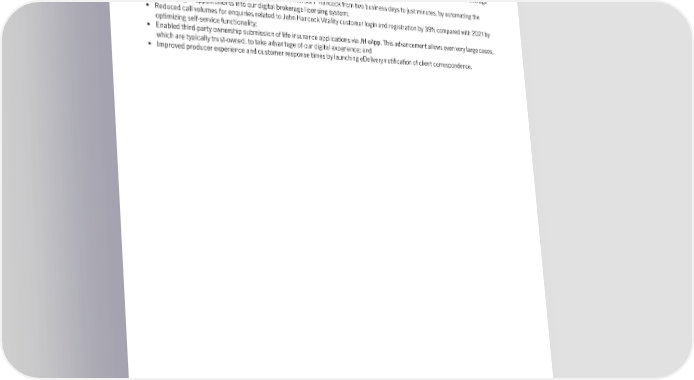 ® life insurance carrier to make GRAIL’s Galleri test available, we are enabling eligible customers to take proactive steps to better understand and make more informed choices about their health; and • Reported record APE sales and case placements in our international business. We signed new distributors in the Latin America region and launched a whole life product to support continued sales growth and diversify the business across geographies. In 2022, we achieved the following digital successes, improving the producer and customer experience while also contributing to a more cost-efficient operation: • Reduced the average time to complete background checks for new producers within our digital brokerage and traditional brokerage channels by over 90% via automation; • Accelerated new producers’ ability to place cases with John Hancock from two business days to just minutes, by automating the scheduling of appointments into our digital brokerage licensing system; • Reduced call volumes for enquiries related to John Hancock Vitality customer login and registration by 39% compared with 2021 by optimizing self-service functionality; • Enabled third-party ownership submission of life insurance applications via JH eApp. This advancement allows even very large cases, which are typically trust-owned, to take advantage of our digital experience; and • Improved producer experience and customer response times by launching eDelivery notification of client correspondence. 31