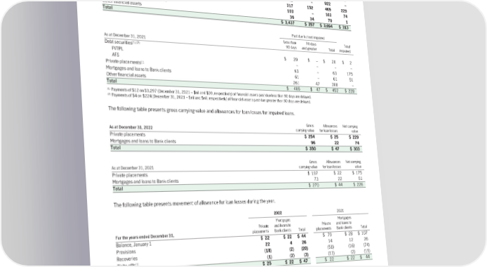 The following table presents the carrying value of financial assets with some or all of their contractual payments past due but which are not impaired and impaired financial assets. Past due but not impaired Less than 90 days Total As at December 31, 2022 90 days and greater Total impaired (1),(2) Debt securities FVTPL $ 2,059 $ 71 $ 2,130 $ 9 AFS 922 – 922 – (1) Private placements 317 152 469 229 Mortgages and loans to Bank clients 103 – 103 74 Other financial assets 36 34 70 1 Total $ 3,437 $ 257 $ 3,694 $ 313 Past due but not impaired Less than 90 days Total As at December 31, 2021 90 days and greater Total impaired (1),(2) Debt securities FVTPL $2 0 $–$ 20$ 2 AFS – – – – (1) Private placements 63 – 63 175 Mortgages and loans to Bank clients 61 – 61 51 Other financial assets 261 47 308 – Total $ 405 $ 47 $ 452 $ 228 (1) Payments of $12 on $3,297 (December 31, 2021 – $nil and $20, respectively) of financial assets past due less than 90 days are delayed. (2) Payments of $4 on $224 (December 31, 2021 – $nil and $nil, respectively) of financial assets past due greater than 90 days are delayed. The following table presents gross carrying value and allowances for loan losses for impaired loans. Gross Allowances Net carrying As at December 31, 2022 carrying value for loan losses value Private placements $ 254 $ 25 $ 229 Mortgages and loans to Bank clients 96 22 74 Total $ 350 $ 47 $ 303 Gross Allowances Net carrying As at December 31, 2021 carrying value for loan losses value Private placements $ 197 $ 22 $ 175 Mortgages and loans to Bank clients 73 22 51 Total $ 270 $ 44 $ 226 The following table presents movement of allowance for loan losses during the year. 2022 2021 Mortgages Mortgages Private and loans to Private and loans to For the years ended December 31, placements Bank clients Total placements Bank clients Total Balance, January 1 $22 $22 $44 $ 79 $ 28 $ 107 Provisions 22 4 26 14 12 26 Recoveries (18) (2) (20) (58) (16) (74) (1) Write-offs (1) (2) (3) (13) (2) (15) Balance, December 31 $25 $22 $47 $ 22 $ 22 $ 44 (1) Includes disposals and impact of changes in foreign exchange rates. (b) Securitieslending,repurchaseandreverserepurchasetransactions The Company engages in securities lending to generate fee income. Collateral exceeding the market value of the loaned securities is retained by the Company until the underlying security has been returned to the Company. The market value of the loaned securities is monitored daily and additional collateral is obtained or refunded as the market value of the underlying loaned securities fluctuates. As at December 31, 2022, the Company had loaned securities (which are included in invested assets) with a market value of $723 (2021 – $564). The Company holds collateral with a current market value that exceeds the value of securities lent in all cases. 189