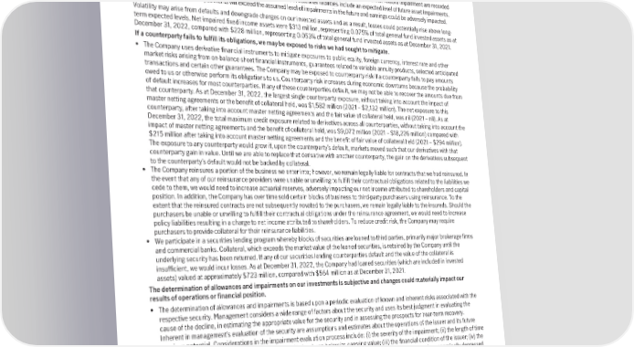 CreditRiskFactors Borrower or counterparty defaults or downgrades could adversely impact our earnings. Worsening regional and global economic conditions could result in borrower or counterparty defaults or downgrades and could lead to increased provisions or impairments related to our general fund invested assets and off-balance sheet derivative financial instruments, and an increase in provisions for future credit impairments to be included in our policy liabilities. Any of our reinsurance providers being unable or unwilling to fulfill their contractual obligations related to the liabilities we cede to them could lead to an increase in policy liabilities. Our invested assets primarily include investment grade bonds, private placements, commercial mortgages, asset-backed securities, and consumer loans. These assets are generally carried at fair value, but changes in value that arise from a credit-related impairment are recorded as a charge against income. The return assumptions incorporated in actuarial liabilities include an expected level of future asset impairments. There is a risk that actual impairments will exceed the assumed level of impairments in the future and earnings could be adversely impacted. Volatility may arise from defaults and downgrade charges on our invested assets and as a result, losses could potentially rise above long- term expected levels. Net impaired fixed income assets were $313 million, representing 0.075% of total general fund invested assets as at December 31, 2022, compared with $228 million, representing 0.053% of total general fund invested assets as at December 31, 2021. If a counterparty fails to fulfill its obligations, we may be exposed to risks we had sought to mitigate. • The Company uses derivative financial instruments to mitigate exposures to public equity, foreign currency, interest rate and other market risks arising from on-balance sheet financial instruments, guarantees related to variable annuity products, selected anticipated transactions and certain other guarantees. The Company may be exposed to counterparty risk if a counterparty fails to pay amounts owed to us or otherwise perform its obligations to us. Counterparty risk increases during economic downturns because the probability of default increases for most counterparties. If any of these counterparties default, we may not be able to recover the amounts due from that counterparty. As at December 31, 2022, the largest single counterparty exposure, without taking into account the impact of master netting agreements or the benefit of collateral held, was $1,582 million (2021 – $2,132 million). The net exposure to this counterparty, after taking into account master netting agreements and the fair value of collateral held, was nil (2021 – nil). As at December 31, 2022, the total maximum credit exposure related to derivatives across all counterparties, without taking into account the impact of master netting agreements and the benefit of collateral held, was $9,072 million (2021 – $18,226 million) compared with $215 million after taking into account master netting agreements and the benefit of fair value of collateral held (2021 – $294 million). The exposure to any counterparty would grow if, upon the counterparty’s default, markets moved such that our derivatives with that counterparty gain in value. Until we are able to replace that derivative with another counterparty, the gain on the derivatives subsequent to the counterparty’s default would not be backed by collateral. • The Company reinsures a portion of the business we enter into; however, we remain legally liable for contracts that we had reinsured. In the event that any of our reinsurance providers were unable or unwilling to fulfill their contractual obligations related to the liabilities we cede to them, we would need to increase actuarial reserves, adversely impacting our net income attributed to shareholders and capital position. In addition, the Company has over time sold certain blocks of business to third-party purchasers using reinsurance. To the extent that the reinsured contracts are not subsequently novated to the purchasers, we remain legally liable to the insureds. Should the purchasers be unable or unwilling to fulfill their contractual obligations under the reinsurance agreement, we would need to increase policy liabilities resulting in a charge to net income attributed to shareholders. To reduce credit risk, the Company may require purchasers to provide collateral for their reinsurance liabilities. • We participate in a securities lending program whereby blocks of securities are loaned to third parties, primarily major brokerage firms and commercial banks. Collateral, which exceeds the market value of the loaned securities, is retained by the Company until the underlying security has been returned. If any of our securities lending counterparties default and the value of the collateral is insufficient, we would incur losses. As at December 31, 2022, the Company had loaned securities (which are included in invested assets) valued at approximately $723 million, compared with $564 million as at December 31, 2021. The determination of allowances and impairments on our investments is subjective and changes could materially impact our results of operations or financial position. • The determination of allowances and impairments is based upon a periodic evaluation of known and inherent risks associated with the respective security. Management considers a wide range of factors about the security and uses its best judgment in evaluating the cause of the decline, in estimating the appropriate value for the security and in assessing the prospects for near-term recovery. Inherent in management’s evaluation of the security are assumptions and estimates about the operations of the issuer and its future earnings potential. Considerations in the impairment evaluation process include: (i) the severity of the i