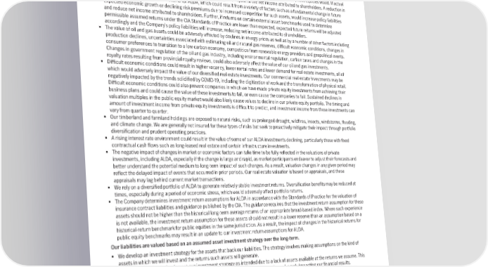 • For segregated fund and variable annuity products that contain investment guarantees in the form of benefit guarantees, a sustained increase in interest rate volatility or a decline in interest rates would increase the costs of hedging the benefit guarantees provided. The impact of changes in interest rates are managed within the variable annuity dynamic hedging program. We experience ALDA performance risk when actual returns are lower than expected returns. • ALDA performance risk arises from general fund investments in directly-owned real estate, timber properties, farmland properties, infrastructure, oil and gas assets, and private equities. • Where these assets are used to support policy liabilities, the policy valuation incorporates projected investment returns on these assets. ALDA assumptions vary by asset class and generally have a similar impact on policy liabilities as public equities would. If actual returns are lower than the expected returns, there will be a negative impact to the net income attributed to shareholders. A reduction in the outlook for expected future returns for ALDA, which could result from a variety of factors such as a fundamental change in future expected economic growth or declining risk premiums due to increased competition for such assets, would increase policy liabilities and reduce net income attributed to shareholders. Further, if returns on certain external asset benchmarks used to determine permissible assumed returns under the CIA Standards of Practice are lower than expected, expected future returns will be adjusted accordingly and the Company’s policy liabilities will increase, reducing net income attributed to shareholders. • The value of oil and gas assets could be adversely affected by declines in energy prices as well as by a number of other factors including production declines, uncertainties associated with estimating oil and natural gas reserves, difficult economic conditions, changes in consumer preferences to transition to a low-carbon economy, competition from renewable energy providers and geopolitical events. Changes in government regulation of the oil and gas industry, including environmental regulation, carbon taxes and changes in the royalty rates resulting from provincial royalty reviews, could also adversely affect the value of our oil and gas investments. • Difficult economic conditions could result in higher vacancy, lower rental rates and lower demand for real estate investments, all of which would adversely impact the value of our diversified real estate investments. Our commercial real estate investments may be negatively impacted by the trends solidified by COVID-19, including the digitization of work and the transformation of physical retail. Difficult economic conditions could also prevent companies in which we have made private equity investments from achieving their business plans and could cause the value of these investments to fall, or even cause the companies to fail. Sustained declines in valuation multiples in the public equity market would also likely cause values to decline in our private equity portfolio. The timing and amount of investment income from private equity investments is difficult to predict, and investment income from these investments can vary from quarter to quarter. • Our timberland and farmland holdings are exposed to natural risks, such as prolonged drought, wildfires, insects, windstorms, flooding, and climate change. We are generally not insured for these types of risks but seek to proactively mitigate their impact through portfolio diversification and prudent operating practices. • A rising interest rate environment could result in the value of some of our ALDA investments declining, particularly those with fixed contractual cash flows such as long-leased real estate and certain infrastructure investments. • The negative impact of changes in market or economic factors can take time to be fully reflected in the valuations of private investments, including ALDA, especially if the change is large and rapid, as market participants endeavor to adjust their forecasts and better understand the potential medium to long-term impact of such changes. As a result, valuation changes in any given period may reflect the delayed impact of events that occurred in prior periods. Our real estate valuation is based on appraisals, and these appraisals may lag behind current market transactions. • We rely on a diversified portfolio of ALDA to generate relatively stable investment returns. Diversification benefits may be reduced at times, especially during a period of economic stress, which would adversely affect portfolio returns. • The Company determines investment return assumptions for ALDA in accordance with the Standards of Practice for the valuation of insurance contract liabilities and guidance published by the CIA. The guidance requires that the investment return assumption for these assets should not be higher than the historical long-term average returns of an appropriate broad-based index. Where such experience is not available, the investment return assumption for these assets should not result in a lower reserve than an assumption based on a historical-return benchmark for public equities in the same jurisdiction. As a result, the impact of changes in the historical returns for public equity benchmarks may result in an update to our investment return assumptions for ALDA. Our liabilities are valued based on an assumed asset investment strategy over the long-term. • We develop an investment strategy for the assets that back our liabilities. The strategy involves making assumptions on the kind of assets in which we will invest and the returns such assets will generate. • We may not be able to implement our investment strategy as intended due to a lack of assets available at the returns we assume. This may result in a change in investment strategy and/or assumed future retur