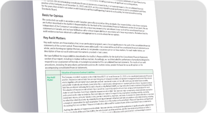 Report of Independent Registered Public Accounting Firm To the Shareholders and Board of Directors of Manulife Financial Corporation Opinion We have audited the consolidated financial statements of Manulife Financial Corporation (the Company), which comprise the Consolidated Statements of Financial Position as at December 31, 2022 and 2021, and the Consolidated Statements of Income, Consolidated Statements of Comprehensive Income, Consolidated Statements of Changes in Equity and Consolidated Statements of Cash Flows for the years then ended, and notes to the consolidated financial statements, including a summary of significant accounting policies. In our opinion, the accompanying consolidated financial statements present fairly, in all material respects, the consolidated financial position of the Company as at December 31, 2022 and 2021, and its consolidated financial performance and its consolidated cash flows for the years then ended in accordance with International Financial Reporting Standards as issued by the International Accounting Standards Board. Basis for Opinion We conducted our audit in accordance with Canadian generally accepted auditing standards. Our responsibilities under those standards are further described in the Auditor’s Responsibilities for the Audit of the Consolidated Financial Statements section of our report. We are independent of the Company in accordance with the ethical requirements that are relevant to our audit of the consolidated financial statements in Canada, and we have fulfilled our other ethical responsibilities in accordance with these requirements. We believe that the audit evidence we have obtained is sufficient and appropriate to provide a basis for our opinion. Key Audit Matters Key audit matters are those matters that, in our professional judgment, were of most significance in the audit of the consolidated financial statements of the current period. These matters were addressed in the context of the audit of the consolidated financial statements as a whole, and in forming our opinion thereon, and we do not provide a separate opinion on these matters. For each matter below, our description of how our audit addressed the matter is provided in that context. We have fulfilled the responsibilities described in the Auditor’s Responsibilities for the Audit of the Consolidated Financial Statements section of our report, including in relation to these matters. Accordingly, our audit included the performance of procedures designed to respond to our assessment of the risks of material misstatement of the consolidated financial statements. The results of our audit procedures, including the procedures performed to address the matters below, provide the basis for our audit opinion on the accompanying consolidated financial statements. Valuation of Insurance Contract Liabilities KeyAudit The Company recorded insurance contract liabilities of $371 billion at December 31, 2022 on its consolidated statement of financial Matter position. Insurance contract liabilities are reported gross of reinsurance ceded and represent management’s estimate of the amount which, together with estimated future premiums and net investment income, will be sufficient to pay estimated future benefits, policyholder dividends and refunds, taxes (other than income taxes) and expenses on insurance policies in-force. Insurance contract liabilities are determined using the Canadian Asset Liability Method (CALM), as required by the Canadian Institute of Actuaries (CIA). The valuation of insurance contract liabilities is based on an explicit projection of cash flows using current assumptions for each material cash flow item. Cash flows related to insurance contract liabilities have two major components: a best estimate assumption and a provision for adverse deviation. Best estimates are made with respect to key assumptions including mortality, morbidity, investment returns, policy termination rates, premium persistency, expenses, and taxes. A provision for adverse deviation is recorded to reflect the inherent uncertainty related to the timing and amount of the best estimate assumptions and is determined by including a margin of conservatism for each assumption. Disclosures on this matter are found in Note 1 ‘Nature of Operations and Significant Accounting Policies’ and Note 7 ‘Insurance Contract Liabilities and Reinsurance Assets’ of the consolidated financial statements. Auditing the valuation of insurance contract liabilities was complex and required the application of significant auditor judgment due to the complexity of the cash flow models, the selection and use of assumptions, and the interrelationship of these variables in measuring insurance contract liabilities. The audit effort involved professionals with specialized skill and knowledge to assist in evaluating the audit evidence obtained. 132 | 2022AnnualReport | ConsolidatedFinancialStatements