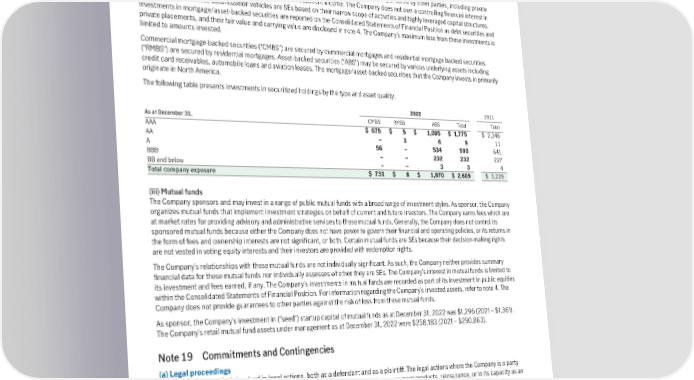 infrastructure, oil and gas, private equity, real estate and agriculture, organized as limited partnerships and limited liability companies. Most of these other entities are not sponsored by the Company. The Company’s involvement with these other entities is not individually significant. As such, the Company neither provides summary financial data for these entities nor individually assesses whether they are SEs. The Company’s maximum exposure to losses because of its involvement with these other entities is limited to its investment in them and amounts committed to be invested but not yet funded. The Company records its income from these entities in net investment income and AOCI. The Company does not provide guarantees to other parties against the risk of loss from these other entities. (ii) Interest in securitized assets The Company invests in mortgage/asset-backed securities issued by securitization vehicles sponsored by other parties, including private issuers and government sponsored issuers, to generate investment income. The Company does not own a controlling financial interest in any of the issuers. These securitization vehicles are SEs based on their narrow scope of activities and highly leveraged capital structures. Investments in mortgage/asset-backed securities are reported on the Consolidated Statements of Financial Position as debt securities and private placements, and their fair value and carrying value are disclosed in note 4. The Company’s maximum loss from these investments is limited to amounts invested. Commercial mortgage-backed securities (“CMBS”) are secured by commercial mortgages and residential mortgage backed securities (“RMBS”) are secured by residential mortgages. Asset-backed securities (“ABS”) may be secured by various underlying assets including credit card receivables, automobile loans and aviation leases. The mortgage/asset-backed securities that the Company invests in primarily originate in North America. The following table presents investments in securitized holdings by the type and asset quality. 2022 2021 As at December 31, CMBS RMBS ABS Total Total AAA $ 675 $ 5 $ 1,095 $ 1,775 $ 2,346 AA – 3 6 9 11 A 56 – 534 590 641 BBB – – 232 232 227 BB and below – – 3 3 4 Total company exposure $ 731 $ 8 $ 1,870 $ 2,609 $ 3,229 (iii) Mutual funds The Company sponsors and may invest in a range of public mutual funds with a broad range of investment styles. As sponsor, the Company organizes mutual funds that implement investment strategies on behalf of current and future investors. The Company earns fees which are at market rates for providing advisory and administrative services to these mutual funds. Generally, the Company does not control its sponsored mutual funds because either the Company does not have power to govern their financial and operating policies, or its returns in the form of fees and ownership interests are not significant, or both. Certain mutual funds are SEs because their decision-making rights are not vested in voting equity interests and their investors are provided with redemption rights. The Company’s relationships with these mutual funds are not individually significant. As such, the Company neither provides summary financial data for these mutual funds nor individually assesses whether they are SEs. The Company’s interest in mutual funds is limited to its investment and fees earned, if any. The Company’s investments in mutual funds are recorded as part of its investment in public equities within the Consolidated Statements of Financial Position. For information regarding the Company’s invested assets, refer to note 4. The Company does not provide guarantees to other parties against the risk of loss from these mutual funds. As sponsor, the Company’s investment in (“seed”) startup capital of mutual funds as at December 31, 2022 was $1,296 (2021 – $1,361). The Company’s retail mutual fund assets under management as at December 31, 2022 were $258,183 (2021 – $290,863). Note 19 Commitments and Contingencies (a) Legalproceedings The Company is regularly involved in legal actions, both as a defendant and as a plaintiff. The legal actions where the Company is a party ordinarily relate to its activities as a provider of insurance protection or wealth management products, reinsurance, or in its capacity as an investment adviser, employer, or taxpayer. Other life insurers and asset managers, operating in the jurisdictions in which the Company does business, have been subject to a wide variety of other types of actions, some of which resulted in substantial judgments or settlements against the defendants; it is possible that the Company may become involved in similar actions in the future. In addition, government and regulatory bodies in Canada, the United States, Asia and other jurisdictions where the Company conducts business regularly make inquiries and, from time to time, require the production of information or conduct examinations concerning the Company’s compliance with, among other things, insurance laws, securities laws, and laws governing the activities of broker-dealers. In June 2018, a class action was initiated against John Hancock Life Insurance Company (U.S.A.) (“JHUSA”) and John Hancock Life Insurance Company of New York (“JHNY”) in the U.S. District Court for the Southern District of New York on behalf of owners of 208 | 2022AnnualReport | NotestoConsolidatedFinancialStatements