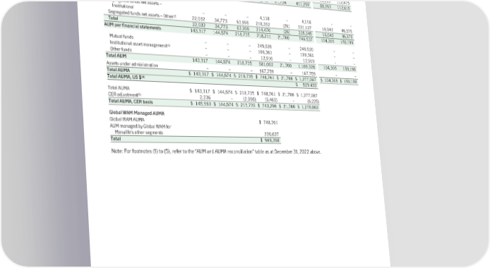 CAD $ US $(4) September 30, 2022 September 30, 2022 Global Corporate As at Asia Canada U.S. WAM and Other Total Asia U.S. Total Invested Assets Manulife Bank net lending assets $ – $ 24,637 $ – $ – $ – $ 24,637 $ – $ – (1) Derivative reclassification – – – – 5,880 5,880 – – Invested assets excluding above items 121,285 85,164 154,739 3,741 15,846 380,775 88,263 112,615 Total 121,285 109,801 154,739 3,741 21,726 411,292 88,263 112,615 Segregated funds net assets Segregated funds net assets – Institutional – – – 4,118 – 4,118 – – (2) Segregated funds net assets – Other 22,032 34,773 63,996 210,352 (26) 331,127 16,042 46,575 Total 22,032 34,773 63,996 214,470 (26) 335,245 16,042 46,575 AUM per financial statements 143,317 144,574 218,735 218,211 21,700 746,537 104,305 159,190 Mutual funds – – – 249,520 – 249,520 – – (3) Institutional asset management – – – 100,361 – 100,361 – – Other funds – – – 12,910 – 12,910 – – Total AUM 143,317 144,574 218,735 581,002 21,700 1,109,328 104,305 159,190 Assets under administration – – – 167,759 – 167,759 – – Total AUMA $ 143,317 $ 144,574 $ 218,735 $ 748,761 $ 21,700 $ 1,277,087 $ 104,305 $ 159,190 (4) Total AUMA, US $ $ 929,433 Total AUMA $ 143,317 $ 144,574 $ 218,735 $ 748,761 $ 21,700 $ 1,277,087 (5) CER adjustment 2,236 – (2,996) (5,465) – (6,225) Total AUMA, CER basis $ 145,553 $ 144,574 $ 215,739 $ 743,296 $ 21,700 $ 1,270,862 Global WAM Managed AUMA Global WAM AUMA $ 748,761 AUM managed by Global WAM for Manulife’s other segments 220,637 Total $ 969,398 Note: For footnotes (1) to (5), refer to the “AUM and AUMA reconciliation” table as at December 31, 2022 above. 119