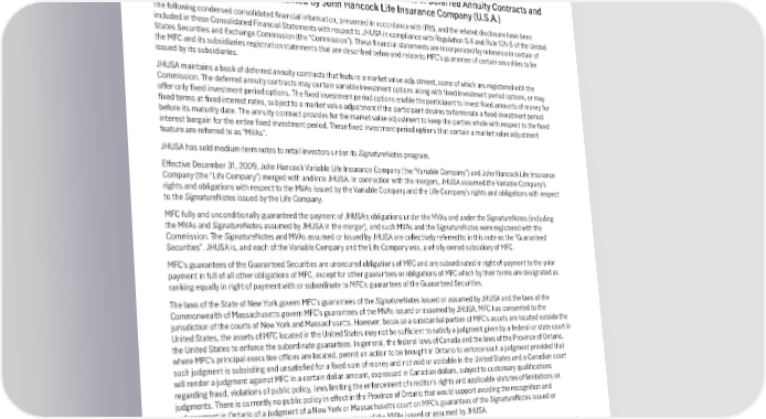Segregated funds assets may be exposed to a variety of financial and other risks. These risks are primarily mitigated by investment guidelines that are actively monitored by professional and experienced portfolio advisors. The Company is not exposed to these risks beyond the liabilities related to the guarantees associated with certain variable life and annuity products included in segregated funds. Accordingly, the Company’s exposure to loss from segregated fund products is limited to the value of these guarantees. These guarantees are recorded within the Company’s insurance contract liabilities. Assets supporting these guarantees are recognized in invested assets according to their investment type. Note 24 Information Provided in Connection with Investments in Deferred Annuity Contracts and SignatureNotes Issued or Assumed by John Hancock Life Insurance Company (U.S.A.) The following condensed consolidated financial information, presented in accordance with IFRS, and the related disclosure have been included in these Consolidated Financial Statements with respect to JHUSA in compliance with Regulation S-X and Rule 12h-5 of the United States Securities and Exchange Commission (the “Commission”). These financial statements are incorporated by reference in certain of the MFC and its subsidiaries registration statements that are described below and relate to MFC’s guarantee of certain securities to be issued by its subsidiaries. JHUSA maintains a book of deferred annuity contracts that feature a market value adjustment, some of which are registered with the Commission. The deferred annuity contracts may contain variable investment options along with fixed investment period options, or may offer only fixed investment period options. The fixed investment period options enable the participant to invest fixed amounts of money for fixed terms at fixed interest rates, subject to a market value adjustment if the participant desires to terminate a fixed investment period before its maturity date. The annuity contract provides for the market value adjustment to keep the parties whole with respect to the fixed interest bargain for the entire fixed investment period. These fixed investment period options that contain a market value adjustment feature are referred to as “MVAs”. JHUSA has sold medium-term notes to retail investors under its SignatureNotes program. Effective December 31, 2009, John Hancock Variable Life Insurance Company (the “Variable Company”) and John Hancock Life Insurance Company (the “Life Company”) merged with and into JHUSA. In connection with the mergers, JHUSA assumed the Variable Company’s rights and obligations with respect to the MVAs issued by the Variable Company and the Life Company’s rights and obligations with respect to the SignatureNotes issued by the Life Company. MFC fully and unconditionally guaranteed the payment of JHUSA’s obligations under the MVAs and under the SignatureNotes (including the MVAs and SignatureNotes assumed by JHUSA in the merger), and such MVAs and the SignatureNotes were registered with the Commission. The SignatureNotes and MVAs assumed or issued by JHUSA are collectively referred to in this note as the “Guaranteed Securities”. JHUSA is, and each of the Variable Company and the Life Company was, a wholly owned subsidiary of MFC. MFC’s guarantees of the Guaranteed Securities are unsecured obligations of MFC and are subordinated in right of payment to the prior payment in full of all other obligations of MFC, except for other guarantees or obligations of MFC which by their terms are designated as ranking equally in right of payment with or subordinate to MFC’s guarantees of the Guaranteed Securities. The laws of the State of New York govern MFC’s guarantees of the SignatureNotes issued or assumed by JHUSA and the laws of the Commonwealth of Massachusetts govern MFC’s guarantees of the MVAs issued or assumed by JHUSA. MFC has consented to the jurisdiction of the courts of New York and Massachusetts. However, because a substantial portion of MFC’s assets are located outside the United States, the assets of MFC located in the United States may not be sufficient to satisfy a judgment given by a federal or state court in the United States to enforce the subordinate guarantees. In general, the federal laws of Canada and the laws of the Province of Ontario, where MFC’s principal executive offices are located, permit an action to be brought in Ontario to enforce such a judgment provided that such judgment is subsisting and unsatisfied for a fixed sum of money and not void or voidable in the United States and a Canadian court will render a judgment against MFC in a certain dollar amount, expressed in Canadian dollars, subject to customary qualifications regarding fraud, violations of public policy, laws limiting the enforcement of creditor’s rights and applicable statutes of limitations on judgments. There is currently no public policy in effect in the Province of Ontario that would support avoiding the recognition and enforcement in Ontario of a judgment of a New York or Massachusetts court on MFC’s guarantees of the SignatureNotes issued or assumed by JHUSA or a Massachusetts court on guarantees of the MVAs issued or assumed by JHUSA. MFC is a holding company. MFC’s assets primarily consist of investments in its subsidiaries. MFC’s cash flows primarily consist of dividends and interest payments from its operating subsidiaries, offset by expenses and shareholder dividends and MFC stock repurchases. As a holding company, MFC’s ability to meet its cash requirements, including, but not limited to, paying any amounts due under its guarantees, substantially depends upon dividends from its operating subsidiaries. These subsidiaries are subject to certain regulatory restrictions under laws in Canada, the United States and certain other countries, which may limit their ability to pay dividends or make contr