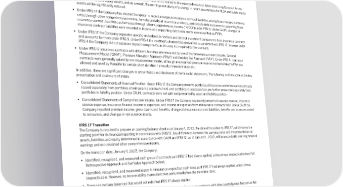 profitability and issuance period to limit offsetting of new business gains and losses. Such aggregation of contracts into groups is required on initial recognition and not reassessed subsequently. Under CALM, new business gains and new business losses offset each other in income. • Under IFRS 17 the discount rate used to estimate the present value of insurance contract liabilities is based on the characteristics of the liabilities. Under CALM, the rates of returns for current and projected assets supporting insurance contract liabilities were used to value the liabilities. The difference in the discount rate approach also impacts the timing of investment results. Under IFRS 17, the impact of investing activities will emerge into earnings over the life of the assets. Under CALM, the impact of investing activities was capitalized into reserves and therefore earnings in the period they occurred. • Under IFRS 17 the insurance contract liability discount rate is not related to the expected return on Alternative Long-Duration Assets (“ALDA”) and public equity assets, and as a result, the earnings sensitivity of a change in return assumptions for ALDA and public equity assets will be significantly reduced. • Under IFRS 17 the Company has elected the option to record changes in insurance contract liabilities arising from changes in interest rates through other comprehensive income, for substantially all insurance products, and classify debt instruments supporting these insurance contract liabilities as fair value through other comprehensive income (“FVOCI”) under IFRS 9. Under CALM, changes in insurance contract liabilities were recorded in income and supporting debt instruments were classified as FVTPL. • Under IFRS 17 the Company separates specific embedded derivatives and distinct investment components from insurance contracts and accounts for them under IFRS 9. Under IFRS 4 the treatment of embedded derivatives is consistent with IFRS 17, however under IFRS 4 the Company did not separate deposit components as this was not required by the standard. • Under IFRS 17 insurance contracts with different features are measured by one of the three measurement models: General Measurement Model (“GMM”), Premium Allocation Approach (“PAA”) and Variable Fee Approach (“VFA”). Under IFRS 4, insurance contracts were generally valued by one measurement model, although an unearned premium reserve method similar to PAA was allowed and used by Manulife for certain short duration / annually renewable business. In addition, there are significant changes to presentation and disclosure of the financial statements. The following outlines some of the key presentation and disclosure changes: • Consolidated Statements of Financial Position: Under IFRS 17 the Company presents portfolios of insurance and reinsurance contracts issued separately from portfolios of reinsurance contracts held, and portfolios in asset position are further presented separately from portfolios in liability position. Under CALM, contracts were not split and presented by asset and liability position. • Consolidated Statements of Comprehensive Income: Under IFRS 17 the Company separately presents insurance revenue, insurance service expense, insurance finance income or expenses, and income or expenses from reinsurance contracts held. Under CALM the Company reported premium income, gross claims and benefits, changes in insurance contract liabilities, benefits and expenses ceded to reinsurers, and changes in reinsurance assets. IFRS17Transition The Company is required to prepare an opening balance sheet as at January 1, 2022, the date of transition to IFRS 17, which forms the starting point for its financial reporting in accordance with IFRS 17. Any differences between the carrying value and the presentation of assets, liabilities and equity determined in accordance with CALM and IFRS 17, as at January 1, 2022, will be recorded in opening retained earnings and accumulated other comprehensive income. On the transition date, January 1, 2022, the Company; • Identified, recognized, and measured each group of contracts as if IFRS 17 had always applied, unless it was impracticable (see Full Retrospective Approach and Fair Value Approach below); • Identified, recognized, and measured assets for insurance acquisition cash flows as if IFRS 17 had always applied, unless it was impracticable. However, no recoverability assessment was performed before the transition date; • Derecognized any balances that would not exist had IFRS 17 always applied; • Measured own use real estate properties that were underlying items of insurance contracts with direct participation features at fair value; and • Recognized any resulting net difference in equity. Full Retrospective Approach The Company has adopted IFRS 17 retrospectively unless the full retrospective approach was deemed impracticable. The Company has applied the full retrospective approach to most contracts issued on or after January 1, 2021, except for participating insurance contracts and variable annuity contracts for which the fair value approach was used. 155