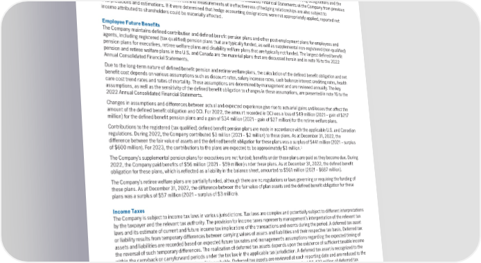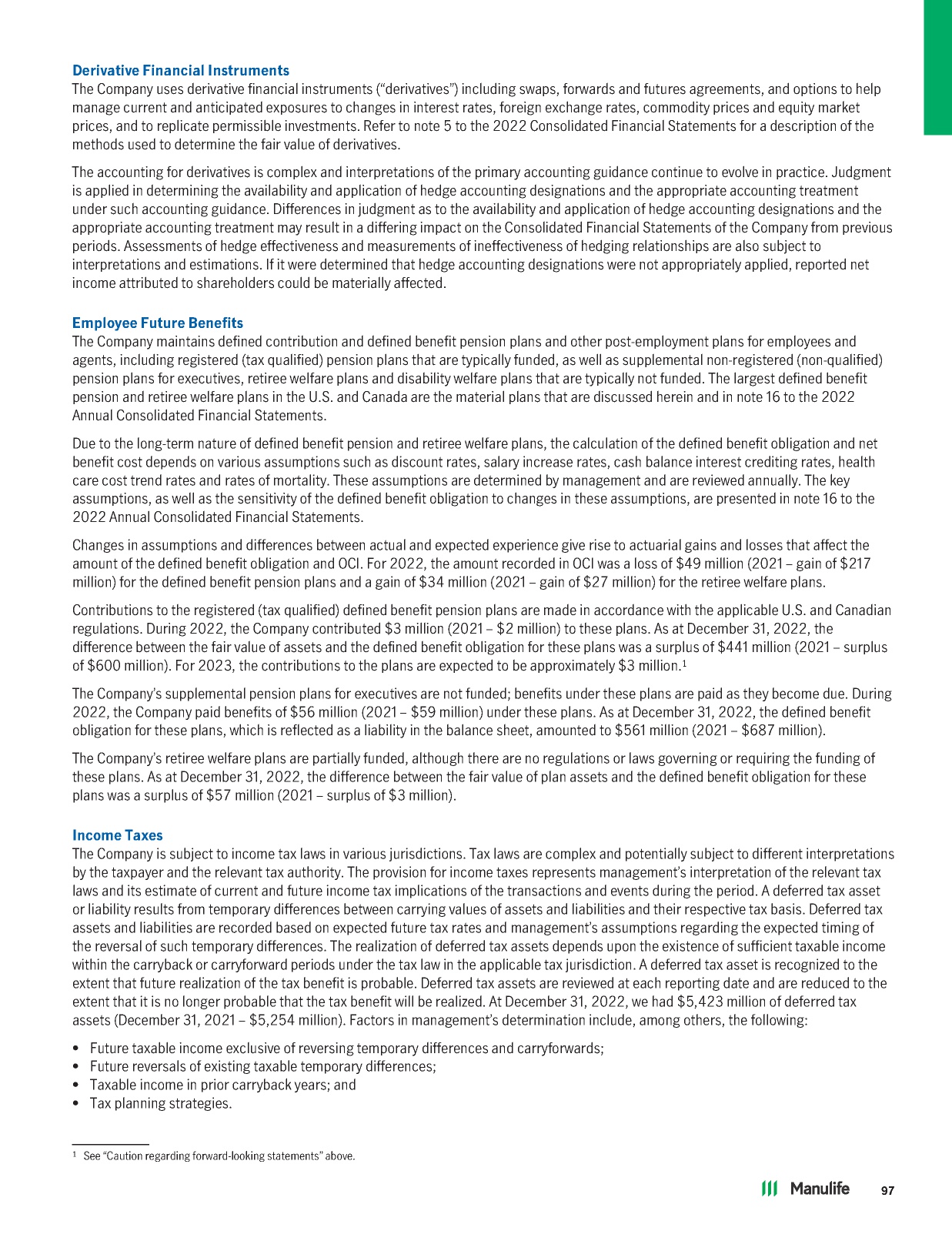 DerivativeFinancialInstruments The Company uses derivative financial instruments (“derivatives”) including swaps, forwards and futures agreements, and options to help manage current and anticipated exposures to changes in interest rates, foreign exchange rates, commodity prices and equity market prices, and to replicate permissible investments. Refer to note 5 to the 2022 Consolidated Financial Statements for a description of the methods used to determine the fair value of derivatives. The accounting for derivatives is complex and interpretations of the primary accounting guidance continue to evolve in practice. Judgment is applied in determining the availability and application of hedge accounting designations and the appropriate accounting treatment under such accounting guidance. Differences in judgment as to the availability and application of hedge accounting designations and the appropriate accounting treatment may result in a differing impact on the Consolidated Financial Statements of the Company from previous periods. Assessments of hedge effectiveness and measurements of ineffectiveness of hedging relationships are also subject to interpretations and estimations. If it were determined that hedge accounting designations were not appropriately applied, reported net income attributed to shareholders could be materially affected. EmployeeFutureBenefits The Company maintains defined contribution and defined benefit pension plans and other post-employment plans for employees and agents, including registered (tax qualified) pension plans that are typically funded, as well as supplemental non-registered (non-qualified) pension plans for executives, retiree welfare plans and disability welfare plans that are typically not funded. The largest defined benefit pension and retiree welfare plans in the U.S. and Canada are the material plans that are discussed herein and in note 16 to the 2022 Annual Consolidated Financial Statements. Due to the long-term nature of defined benefit pension and retiree welfare plans, the calculation of the defined benefit obligation and net benefit cost depends on various assumptions such as discount rates, salary increase rates, cash balance interest crediting rates, health care cost trend rates and rates of mortality. These assumptions are determined by management and are reviewed annually. The key assumptions, as well as the sensitivity of the defined benefit obligation to changes in these assumptions, are presented in note 16 to the 2022 Annual Consolidated Financial Statements. Changes in assumptions and differences between actual and expected experience give rise to actuarial gains and losses that affect the amount of the defined benefit obligation and OCI. For 2022, the amount recorded in OCI was a loss of $49 million (2021 – gain of $217 million) for the defined benefit pension plans and a gain of $34 million (2021 – gain of $27 million) for the retiree welfare plans. Contributions to the registered (tax qualified) defined benefit pension plans are made in accordance with the applicable U.S. and Canadian regulations. During 2022, the Company contributed $3 million (2021 – $2 million) to these plans. As at December 31, 2022, the difference between the fair value of assets and the defined benefit obligation for these plans was a surplus of $441 million (2021 – surplus 1 of $600 million). For 2023, the contributions to the plans are expected to be approximately $3 million. The Company’s supplemental pension plans for executives are not funded; benefits under these plans are paid as they become due. During 2022, the Company paid benefits of $56 million (2021 – $59 million) under these plans. As at December 31, 2022, the defined benefit obligation for these plans, which is reflected as a liability in the balance sheet, amounted to $561 million (2021 – $687 million). The Company’s retiree welfare plans are partially funded, although there are no regulations or laws governing or requiring the funding of these plans. As at December 31, 2022, the difference between the fair value of plan assets and the defined benefit obligation for these plans was a surplus of $57 million (2021 – surplus of $3 million). IncomeTaxes The Company is subject to income tax laws in various jurisdictions. Tax laws are complex and potentially subject to different interpretations by the taxpayer and the relevant tax authority. The provision for income taxes represents management’s interpretation of the relevant tax laws and its estimate of current and future income tax implications of the transactions and events during the period. A deferred tax asset or liability results from temporary differences between carrying values of assets and liabilities and their respective tax basis. Deferred tax assets and liabilities are recorded based on expected future tax rates and management’s assumptions regarding the expected timing of the reversal of such temporary differences. The realization of deferred tax assets depends upon the existence of sufficient taxable income within the carryback or carryforward periods under the tax law in the applicable tax jurisdiction. A deferred tax asset is recognized to the extent that future realization of the tax benefit is probable. Deferred tax assets are reviewed at each reporting date and are reduced to the extent that it is no longer probable that the tax benefit will be realized. At December 31, 2022, we had $5,423 million of deferred tax assets (December 31, 2021 – $5,254 million). Factors in management’s determination include, among others, the following: • Future taxable income exclusive of reversing temporary differences and carryforwards; • Future reversals of existing taxable temporary differences; • Taxable income in prior carryback years; and • Tax planning strategies. 1 See “Caution regarding forward-looking statements” above. 97
