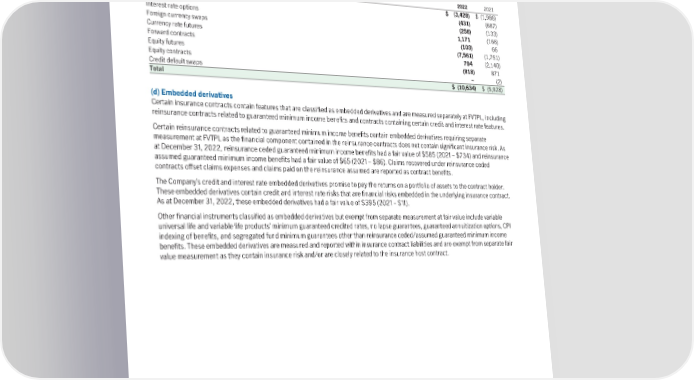 (c) Derivativesnotdesignatedinqualifyinghedgeaccountingrelationships Derivatives used in portfolios supporting insurance contract liabilities are generally not designated in qualifying hedge accounting relationships because the change in the value of the insurance contract liabilities economically hedged by these derivatives is recorded through net income. Since changes in fair value of these derivatives and related hedged risks are recognized in investment income as they occur, they generally offset the change in hedged risk to the extent the hedges are economically effective. Interest rate and cross currency swaps are used in the portfolios supporting insurance contract liabilities to manage duration and currency risks. Investment income on derivatives not designated in qualifying hedge accounting relationships For the years ended December 31, 2022 2021 Interest rate swaps $ (3,428) $ (1,986) Interest rate futures (431) (687) Interest rate options (258) (133) Foreign currency swaps 1,171 (166) Currency rate futures (103) 66 Forward contracts (7,561) (1,751) Equity futures 794 (2,140) Equity contracts (818) 871 Credit default swaps – (2) Total $ (10,634) $ (5,928) (d) Embeddedderivatives Certain insurance contracts contain features that are classified as embedded derivatives and are measured separately at FVTPL, including reinsurance contracts related to guaranteed minimum income benefits and contracts containing certain credit and interest rate features. Certain reinsurance contracts related to guaranteed minimum income benefits contain embedded derivatives requiring separate measurement at FVTPL as the financial component contained in the reinsurance contracts does not contain significant insurance risk. As at December 31, 2022, reinsurance ceded guaranteed minimum income benefits had a fair value of $585 (2021 – $734) and reinsurance assumed guaranteed minimum income benefits had a fair value of $65 (2021 – $86). Claims recovered under reinsurance ceded contracts offset claims expenses and claims paid on the reinsurance assumed are reported as contract benefits. The Company’s credit and interest rate embedded derivatives promise to pay the returns on a portfolio of assets to the contract holder. These embedded derivatives contain credit and interest rate risks that are financial risks embedded in the underlying insurance contract. As at December 31, 2022, these embedded derivatives had a fair value of $395 (2021 – $11). Other financial instruments classified as embedded derivatives but exempt from separate measurement at fair value include variable universal life and variable life products’ minimum guaranteed credited rates, no lapse guarantees, guaranteed annuitization options, CPI indexing of benefits, and segregated fund minimum guarantees other than reinsurance ceded/assumed guaranteed minimum income benefits. These embedded derivatives are measured and reported within insurance contract liabilities and are exempt from separate fair value measurement as they contain insurance risk and/or are closely related to the insurance host contract. 173