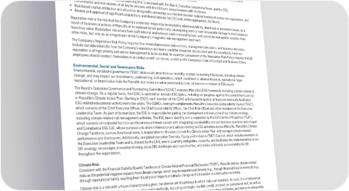 We operate in highly competitive markets and compete for customers with both insurance and non-insurance financial services companies. Customer loyalty and retention, and access to distributors, are important to the Company’s success and are influenced by many factors, including our distribution practices and regulations, product features, service levels including digital capabilities, prices, investment performance, and our financial strength ratings and reputation. Our ability to effectively compete is highly dependent upon being quick to react and adapt to changes from the external environment while continuing to proactively drive internal innovation. StrategicRiskManagementStrategy The CEO and Executive Leadership Team establish and oversee execution of business strategies and have accountability to identify and manage the risks embedded in these strategies. They are supported by a number of processes: • Strategic business, risk and capital planning that is reviewed with the Board, Executive Leadership Team, and the ERC; • Performance and risk reviews of all key businesses with the CEO and annual reviews with the Board; • Risk based capital attribution and allocation designed to encourage a consistent decision-making framework across the organization; and • Review and approval of significant acquisitions and divestitures by the CEO and, where appropriate, the Board. Reputation risk is the risk that the Company’s corporate image may be eroded by adverse publicity, about real or perceived issues, as a result of business practices of Manulife or its representatives potentially causing long-term or even irreparable damage to the Company’s franchise value. Reputation risk arises from both internal and external environmental factors, and cannot be managed in isolation from other risks, but only as an integral part of the Company’s integrated risk management approach. The Company’s Reputation Risk Policy requires that internal processes and controls, management decisions, and business decisions, include considerations for how the Company’s reputation and brand could be impacted. Any incident with the potential to harm our reputation is of high priority and senior management is to be alerted. An essential component of the Reputation Risk Policy requires that all employees should conduct themselves in accordance with our values, as well as the Company’s Code of Conduct and Business Ethics. Environmental,SocialandGovernanceRisks Environmental, social and governance (“ESG”) risks could arise from our inability to adapt to evolving ESG issues, including climate change, and may impact our investments, underwriting, and operations, which could lead to adverse financial, operational, legal, reputational, or brand value risks for Manulife due to our actual or perceived actions, or inaction in relation to ESG issues. The Board’s Corporate Governance and Nominating Committee (“CGNC”) oversees Manulife’s ESG framework, including matters related to climate change. On a regular basis, the CGNC is updated on relevant ESG topics, including our progress against the commitments set out in Manulife’s Climate Action Plan. Starting in 2023, each member of the CGNC will also participate in at least one externally facilitated ESG-related educational activity every two years. The CGNC’s oversight complements Manulife’s Executive Sustainability Council (“ESC”), which consists of the Chief Executive Officer, the Chief Sustainability Officer, the Chief Risk Officer and other members of the Executive Leadership Team. As part of its mandate, the ESC is responsible for guiding the development and execution of our climate strategy, including climate-related risk management activities. The ESC meets monthly and is supported by the ESG Centre of Expertise (“CoE”), which consists of corporate function and business unit leads tasked with integrating sustainability into our business practices and a Legal and Compliance ESG CoE, whose purpose is to share information and advice relating to ESG activities across Manulife. Manulife’s Climate Change Taskforce, a cross-functional team, is responsible for the execution of the Climate Action Plan and manages climate-related performance and disclosures. Additionally, our global executive Diversity, Equity and Inclusion (“DEI”) Council, which includes members of the Executive Leadership Team and is chaired by the CEO, meets quarterly and guides, supports, and facilitates the implementation of our DEI strategy, encourages innovative thinking about DEI challenges and opportunities, and drives and builds accountability for DEI throughout the organization. Climate Risk Consistent with the Financial Stability Board’s Taskforce on Climate-Related Financial Disclosures (“TCFD”), Manulife defines climate-related risks as the potential negative impacts from climate change, which may be experienced directly (e.g., through financial loss) or indirectly (e.g., through reputational harm), resulting from the physical impacts of climate change or the transition to a low-carbon economy. Climate risk is a risk with unique characteristics given the diverse set of pathways in which risks can manifest. As such, it is a transversal risk, that has the potential to impact any of our principal risks, including strategic, market, credit, product, or operational risk, as well as legal and reputational risk. Climate risk, therefore, is viewed as a modifier or an accelerator of existing risk types, and failure to adequately prepare for the potential impacts of climate change can have material adverse impacts on our balance sheet or our ability to operate. Potential impacts of climate change may include business losses or disruption resulting from extreme weather conditions, challenges in adapting to changes in climate-related legal or regulatory frameworks, reputational damage, devaluation of our debt or equity asset exposures to fossil-fuel related or h