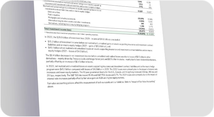 Oil & Gas This category is comprised of $2.2 billion (2021 — $1.9 billion) in various oil and gas private equity interests which are a combination of both producing and mid-streaming assets. Investment Income For the years ended December 31, ($ millions, unless otherwise stated) 2022 2021 Interest income $ 12,290 $ 11,517 (1) Dividend, rental and other income 3,843 4,180 (Impairments)/Recoveries (151) 15 Other, including gains and losses on sale of AFS debt securities (775) (85) Investment income before realized and unrealized gains on assets supporting insurance and investment contract liabilities and on macro equity hedges 15,207 15,627 Realized and unrealized gains and losses on assets supporting insurance and investment contract liabilities and on macro equity hedges Debt securities (32,675) (5,585) Public equities (3,602) 3,220 Mortgages and private placements 394 403 Alternative long-duration assets and other investments 1,349 3,772 Derivatives, including macro equity hedging program (10,543) (5,813) (45,077) (4,003) Totalinvestmentincome(loss) $(29,870) $ 11,624 (1) Rental income from investment properties is net of direct operating expenses. In 2022, the $29.9 billion of investment loss (2021 – income of $11.6 billion) consisted of: • $15.2 billion of investment income before net realized and unrealized gains on assets supporting insurance and investment contract liabilities and on macro equity hedges (2021 – gains of $15.6 billion); and • $45.1 billion of net realized and unrealized losses on assets supporting insurance and investment contract liabilities and on macro equity hedges (2021 – losses of $4.0 billion). The $0.4 billion decrease in net investment income before unrealized and realized losses was due to losses of $0.5 billion in other derivatives – mainly driven by Treasury Locks and longer tenor yield and $0.5 billion in stocks – mainly due to lower dividend distributions, partially offset by an increase of $0.4 billion in bonds. In 2022, net realized and unrealized losses on assets supporting insurance and investment contract liabilities and on the macro hedge program were $45.1 billion compared with losses of $4.0 billion in 2021. The 2022 losses were primarily due to the impact of interest rate increases and lower equity markets. The 10-year government bonds for the U.S., Canada, and Hong Kong increased 236 bps, 186 bps and 211 bps, respectively. The S&P 500 decreased 19.4% and S&P/TSX decreased 8.7%. The 2021 losses were primarily due to the impact of interest rate increases partially offset by fair value gains in ALDA and higher equity markets. Fair value accounting policies affect the measurement of both our assets and our liabilities. Refer to “Impact of Fair Value Accounting” above. 42 | 2022AnnualReport | Management’sDiscussionandAnalysis