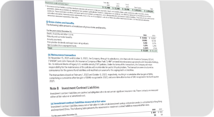 Other updates Other updates resulted in a $119 post-tax gain to net income attributed to shareholders. This was primarily driven by Japan, whereby investment fees for certain mandates in the general account provided by affiliate investment managers were reviewed and updated to align with broader market levels. (i) Insurancecontractscontractualobligations Insurance contracts give rise to obligations fixed by agreement. As at December 31, 2022, the Company’s contractual obligations and commitments relating to insurance contracts are as follows. Lessthan 1to3 3to5 Payments due by period 1 year years years Over 5 years Total (1) Insurance contract liabilities $ 11,498 $ 12,365 $ 18,496 $ 1,012,611 $ 1,054,970 (1) Insurance contract liability cash flows include estimates related to the timing and payment of death and disability claims, policy surrenders, policy maturities, annuity payments, minimum guarantees on segregated fund products, policyholder dividends, commissions and premium taxes offset by contractual future premiums on in-force contracts. These estimated cash flows are based on the best estimate assumptions used in the determination of insurance contract liabilities. These amounts are undiscounted and reflect recoveries from reinsurance agreements. Due to the use of assumptions, actual cash flows may differ from these estimates. Cash flows include embedded derivatives measured separately at fair value. (j) Gross claimsandbenefits The following table presents a breakdown of gross claims and benefits. For the years ended December 31, 2022 2021 Death, disability and other claims $ 19,404 $ 18,583 Maturity and surrender benefits 10,662 8,728 Annuity payments 3,242 3,276 Policyholder dividends and experience rating refunds 1,279 1,255 Net transfers from segregated funds (1,267) (732) Total $ 33,320 $ 31,110 (k) Reinsurancetransaction On November 15, 2021 and October 3, 2022, the Company, through its subsidiaries John Hancock Life Insurance Company (U.S.A.) (“JHUSA”) and John Hancock Life Insurance Company of New York (“JHNY”) entered into reinsurance agreements with Venerable Holdings, Inc. to reinsure blocks of legacy U.S. variable annuity (“VA”) policies. Under the terms of the transactions, the Company will retain responsibility for the maintenance of the policies with no intended impact to VA policyholders. The transactions were structured as coinsurance for the general fund liabilities and modified coinsurance for the segregated fund liabilities. The transactions closed on February 1, 2022 and October 3, 2022, respectively, resulting in a cumulative after-tax gain of $806, comprising a cumulative after-tax gain of $846 recognized in 2022, and a one-time after-tax loss of $40 recognized in the fourth quarter 2021. Note 8 Investment Contract Liabilities Investment contract liabilities are contractual obligations that do not contain significant insurance risk. These contracts are measured either at fair value or at amortized cost. (a) Investmentcontractliabilitiesmeasuredatfairvalue Investment contract liabilities measured at fair value include certain investment savings and pension products sold primarily in Hong Kong and mainland China. The following table presents the movement in investment contract liabilities measured at fair value. For the years ended December 31, 2022 2021 Balance, January 1 $ 802 $ 932 New policies 93 54 Changes in market conditions (39) (38) Redemptions, surrenders and maturities (106) (138) Impact of changes in foreign exchange rates 46 (8) Balance, December 31 $ 796 $ 802 185