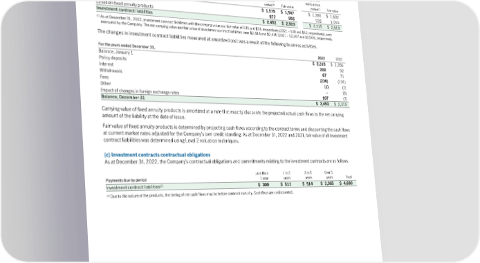 (b) Investmentcontractliabilitiesmeasuredatamortizedcost Investment contract liabilities measured at amortized cost include several fixed annuity products sold in the U.S. and Canada that provide guaranteed income payments for a contractually determined period and are not contingent on survivorship. The following table presents carrying and fair values of investment contract liabilities measured at amortized cost. 2022 2021 Amortized Amortized cost, gross of cost, gross of reinsurance reinsurance As at December 31, (1) Fair value (1) Fair value ceded ceded U.S. fixed annuity products $ 1,575 $ 1,547 $ 1,380 $ 1,602 Canadian fixed annuity products 877 956 935 1,016 Investment contract liabilities $ 2,452 $ 2,503 $ 2,315 $ 2,618 (1) As at December 31, 2022, investment contract liabilities with the carrying value and fair value of $38 and $38, respectively (2021 – $48 and $52, respectively), were reinsured by the Company. The net carrying value and fair value of investment contract liabilities were $2,414 and $2,465 (2021 – $2,267 and $2,566), respectively. The changes in investment contract liabilities measured at amortized cost was a result of the following business activities. For the years ended December 31, 2022 2021 Balance, January 1 $ 2,315 $ 2,356 Policy deposits 200 92 Interest 67 71 Withdrawals (236) (191) Fees (1) (1) Other – (5) Impact of changes in foreign exchange rates 107 (7) Balance, December 31 $ 2,452 $ 2,315 Carrying value of fixed annuity products is amortized at a rate that exactly discounts the projected actual cash flows to the net carrying amount of the liability at the date of issue. Fair value of fixed annuity products is determined by projecting cash flows according to the contract terms and discounting the cash flows at current market rates adjusted for the Company’s own credit standing. As at December 31, 2022 and 2021, fair value of all investment contract liabilities was determined using Level 2 valuation techniques. (c) Investmentcontractscontractualobligations As at December 31, 2022, the Company’s contractual obligations and commitments relating to the investment contracts are as follows. Lessthan 1to3 3to5 Over5 Payments due by period 1 year years years years Total (1) Investment contract liabilities $ 300 $ 511 $ 514 $ 3,365 $ 4,690 (1) Due to the nature of the products, the timing of net cash flows may be before contract maturity. Cash flows are undiscounted. 186 | 2022AnnualReport | NotestoConsolidatedFinancialStatements