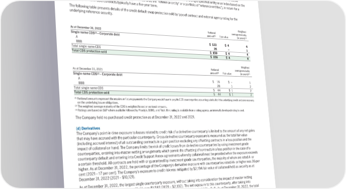 The Company engages in reverse repurchase transactions to generate fee income to take possession of securities to cover short positions in similar instruments and to meet short-term funding requirements. As at December 31, 2022, the Company had engaged in reverse repurchase transactions of $895 (2021 – $1,490) which are recorded as short-term receivables. In addition, the Company had engaged in repurchase transactions of $895 as at December 31, 2022 (2021 – $536) which are recorded as payables. (c) Credit defaultswaps The Company replicates exposure to specific issuers by selling credit protection via credit default swaps (“CDS”) to complement its cash debt securities investing. The Company does not write CDS protection more than its government bond holdings. A CDS is a derivative instrument representing an agreement between two parties to exchange the credit risk of a single specified entity or an index based on the credit risk of a group of entities (all commonly referred to as the “reference entity” or a portfolio of “reference entities”), in return for a periodic premium. CDS contracts typically have a five-year term. The following table presents details of the credit default swap protection sold by type of contract and external agency rating for the underlying reference security. Weighted Notional average maturity (1) (2) As at December 31, 2022 amount Fair value (in years) (3) Single name CDS – Corporate debt A $ 133 $ 4 4 BBB 26 – 1 Total single name CDS $ 159 $ 4 4 Total CDS protection sold $ 159 $ 4 4 Weighted Notional average maturity (1) (2) As at December 31, 2021 amount Fair value (in years) (3) Single name CDS – Corporate debt A $16 $ – 1 BBB 28 1 2 Total single name CDS $44 $ 1 2 Total CDS protection sold $44 $ 1 2 (1) Notional amounts represent the maximum future payments the Company would have to pay its CDS counterparties assuming a default of the underlying credit and zero recovery on the underlying issuer obligations. (2) The weighted average maturity of the CDS is weighted based on notional amounts. (3) Ratings are based on S&P where available followed by Moody’s, DBRS, and Fitch. If no rating is available from a rating agency, an internally developed rating is used. The Company held no purchased credit protection as at December 31, 2022 and 2021. (d) Derivatives The Company’s point-in-time exposure to losses related to credit risk of a derivative counterparty is limited to the amount of any net gains that may have accrued with the particular counterparty. Gross derivative counterparty exposure is measured as the total fair value (including accrued interest) of all outstanding contracts in a gain position excluding any offsetting contracts in a loss position and the impact of collateral on hand. The Company limits the risk of credit losses from derivative counterparties by using investment grade counterparties, entering into master netting arrangements which permit the offsetting of contracts in a loss position in the case of a counterparty default and entering into Credit Support Annex agreements whereby collateral must be provided when the exposure exceeds a certain threshold. All contracts are held with or guaranteed by investment grade counterparties, the majority of whom are rated A- or higher. As at December 31, 2022, the percentage of the Company’s derivative exposure with counterparties rated AA- or higher was 36 per cent (2021 – 17 per cent). The Company’s exposure to credit risk was mitigated by $2,194 fair value of collateral held as security as at December 31, 2022 (2021 – $10,121). As at December 31, 2022, the largest single counterparty exposure, without taking into consideration the impact of master netting agreements or the benefit of collateral held, was $1,582 (2021 – $2,132). The net exposure to this counterparty, after taking into consideration master netting agreements and the fair value of collateral held, was $nil (2021 – $nil). As at December 31, 2022, the total maximum credit exposure related to derivatives across all counterparties, without taking into consideration the impact of master netting agreements and the benefit of collateral held, was $9,072 (2021 – $18,226). (e) Offsetting financial assetsandfinancialliabilities Certain derivatives, securities lent and repurchase agreements have conditional offset rights. The Company does not offset these financial instruments in the Consolidated Statements of Financial Position, as the rights of offset are conditional. 190 | 2022AnnualReport | NotestoConsolidatedFinancialStatements