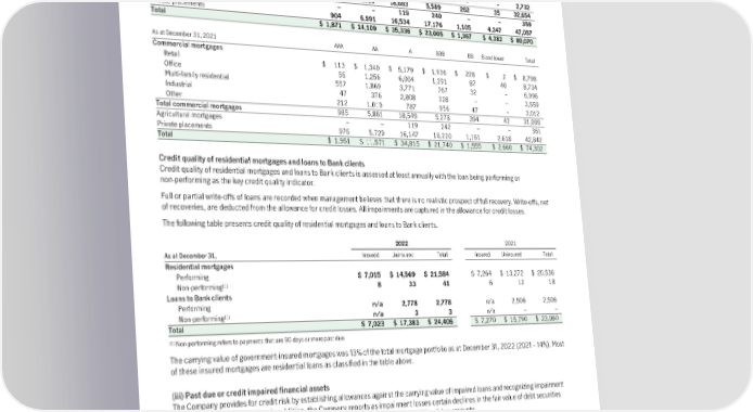 The following table presents the credit quality of commercial mortgages and private placements. As at December 31, 2022 AAA AA A BBB BB B and lower Total Commercial mortgages Retail $ 113 $ 1,526 $ 4,872 $ 2,055 $ 194 $ 2 $ 8,762 Office 102 1,460 5,950 1,471 57 33 9,073 Multi-family residential 500 2,213 3,751 892 11 – 7,367 Industrial 72 929 3,312 407 – – 4,720 Other 180 990 798 764 – – 2,732 Total commercial mortgages 967 7,118 18,683 5,589 262 35 32,654 Agricultural mortgages – – 119 240 – – 359 Private placements 904 6,991 16,534 17,176 1,105 4,347 47,057 Total $ 1,871 $ 14,109 $ 35,336 $ 23,005 $ 1,367 $ 4,382 $ 80,070 As at December 31, 2021 AAA AA A BBB BB B and lower Total Commercial mortgages Retail $ 113 $ 1,340 $ 5,179 $ 1,936 $ 228 $ 2 $ 8,798 Office 56 1,256 6,004 1,291 87 40 8,734 Multi-family residential 557 1,869 3,771 767 32 – 6,996 Industrial 47 376 2,808 328 – – 3,559 Other 212 1,010 787 956 47 – 3,012 Total commercial mortgages 985 5,851 18,549 5,278 394 42 31,099 Agricultural mortgages – – 119 242 – – 361 Private placements 976 5,720 16,147 16,220 1,161 2,618 42,842 Total $ 1,961 $ 11,571 $ 34,815 $ 21,740 $ 1,555 $ 2,660 $ 74,302 Credit quality of residential mortgages and loans to Bank clients Credit quality of residential mortgages and loans to Bank clients is assessed at least annually with the loan being performing or non-performing as the key credit quality indicator. Full or partial write-offs of loans are recorded when management believes that there is no realistic prospect of full recovery. Write-offs, net of recoveries, are deducted from the allowance for credit losses. All impairments are captured in the allowance for credit losses. The following table presents credit quality of residential mortgages and loans to Bank clients. 2022 2021 As at December 31, Insured Uninsured Total Insured Uninsured Total Residential mortgages Performing $ 7,015 $ 14,569 $ 21,584 $ 7,264 $ 13,272 $ 20,536 (1) Non-performing 83341 6 12 18 Loans to Bank clients Performing n/a 2,778 2,778 n/a 2,506 2,506 (1) Non-performing n/a 3 3 n/a – – Total $ 7,023 $ 17,383 $ 24,406 $ 7,270 $ 15,790 $ 23,060 (1) Non-performing refers to payments that are 90 days or more past due. The carrying value of government-insured mortgages was 13% of the total mortgage portfolio as at December 31, 2022 (2021 – 14%). Most of these insured mortgages are residential loans as classified in the table above. (iii) Past due or credit impaired financial assets The Company provides for credit risk by establishing allowances against the carrying value of impaired loans and recognizing impairment losses on AFS debt securities. In addition, the Company reports as impairment losses certain declines in the fair value of debt securities designated as FVTPL which it deems represent impairments due to non-recoverability of due amounts. 188 | 2022AnnualReport | NotestoConsolidatedFinancialStatements