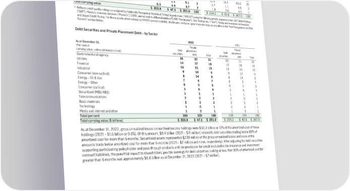 (1) Debt Securities and Private Placement Debt – by Credit Quality 2022 2021 Private Private As at December 31, Debt placement %of Debt placement %of ($ billions) securities debt Total Total securities debt Total Total AAA $ 33.7 $ 0.9 $ 34.6 14 $ 40.1 $ 1.0 $ 41.1 15 AA 36.3 7.0 43.3 17 39.6 5.7 45.3 17 A 83.5 16.5 100.0 40 90.0 16.2 106.2 40 BBB 46.1 17.2 63.3 25 49.4 16.2 65.6 25 BB 4.0 1.1 5.1 2 3.7 1.1 4.8 2 B & lower, and unrated 0.3 4.4 4.7 2 1.4 2.6 4.0 1 Total carrying value $ 203.9 $ 47.1 $ 251.0 100 $ 224.2 $ 42.8 $ 267.0 100 (1) Reflects credit quality ratings as assigned by Nationally Recognized Statistical Rating Organizations (“NRSRO”) using the following priority sequence order: S&P Global Ratings (“S&P”), Moody’s Investors Services (“Moody’s”), DBRS Limited and its affiliated entities (“DBRS Morningstar”), Fitch Ratings Inc. (“Fitch”), Rating and Investment information, and Japan Credit Rating. For those assets where ratings by NRSRO are not available, disclosures are based upon internal ratings as described in the “Risk Management and Risk Factors” section below. Debt Securities and Private Placement Debt – by Sector 2022 2021 As at December 31, Private Private (Per cent of Debt placement Debt placement carrying value, unless otherwise stated) securities debt Total securities debt Total Government and agency 36 10 31 35 11 32 Utilities 14 37 18 14 38 18 Financial 16 11 15 15 10 15 Industrial 9149 9 12 9 Consumer (non-cyclical) 8149 8 14 9 Energy – Oil & Gas 7 4 7 8 5 7 Energy – Other 0 0 0 0 1 0 Consumer (cyclical) 3 6 4 3 6 3 Securitized (MBS/ABS) 1 1 1 1 1 1 Telecommunications 2 0 2 2 0 2 Basic materials 2 3 2 2 2 2 Technology 1 0 1 2 0 1 Media and internet and other 1 0 1 1 0 1 Total per cent 100 100 100 100 100 100 Total carrying value ($ billions) $ 203.9 $ 47.1 $ 251.0 $ 224.2 $ 42.8 $ 267.0 As at December 31, 2022, gross unrealized losses on our fixed income holdings were $33.3 billion or 12% of the amortized cost of these holdings (2021 – $1.6 billion or 0.6%). Of this amount, $8.4 billion (2021 – $11 million) related to debt securities trading below 80% of amortized cost for more than 6 months. Securitized assets represented $228 million of the gross unrealized losses and none of the amounts trade below amortized cost for more than 6 months (2021 – $2 million and none, respectively). After adjusting for debt securities supporting participating policyholder and pass-through products and the provisions for credit included in the insurance and investment contract liabilities, the potential impact to shareholders’ pre-tax earnings for debt securities trading at less than 80% of amortized cost for greater than 6 months was approximately $6.6 billion as at December 31, 2022 (2021 – $7 million). 39
