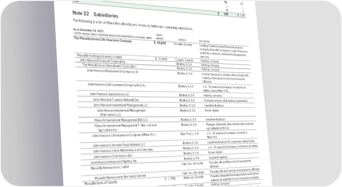 (b) Compensationofkeymanagementpersonnel The Company’s key management personnel are those personnel who have the authority and responsibility for planning, directing and controlling the activities of the Company. Directors (both executive and non-executive) and senior management are considered key management personnel. A summary of compensation of key management personnel is as follows. For the years ended December 31, 2022 2021 Short-term employee benefits $73 $65 Post-employment benefits 6 5 Share-based payments 73 57 Termination benefits – – Other long-term benefits 3 2 Total $ 155 $ 129 Note 22 Subsidiaries The following is a list of Manulife’s directly and indirectly held major operating subsidiaries. As at December 31, 2022 Equity (100% owned unless otherwise noted in brackets beside company name) Interest Address Description The Manufacturers Life Insurance Company $ 65,848 Toronto, Canada Leading Canadian-based financial services company that offers a diverse range of financial protection products and wealth management services Manulife Holdings (Alberta) Limited $ 21,640 Calgary, Canada Holding company John Hancock Financial Corporation Boston, U.S.A. Holding company The Manufacturers Investment Corporation Boston, U.S.A. Holding company John Hancock Reassurance Company Ltd. Boston, U.S.A. Captive insurance subsidiary that provides life, annuity and long-term care reinsurance to affiliates John Hancock Life Insurance Company (U.S.A.) Boston, U.S.A. U.S. life insurance company licensed in all states, except New York John Hancock Subsidiaries LLC Boston, U.S.A. Holding company John Hancock Financial Network, Inc. Boston, U.S.A. Financial services distribution organization John Hancock Investment Management LLC Boston, U.S.A. Investment advisor John Hancock Investment Management Boston, U.S.A. Broker-dealer Distributors LLC Manulife Investment Management (US) LLC Boston, U.S.A. Investment advisor Manulife Investment Management Timberland and Boston, U.S.A. Manager of globally diversified timberland and Agriculture Inc. agricultural portfolios John Hancock Life Insurance Company of New York New York, U.S.A. U.S. life insurance company licensed in New York John Hancock Variable Trust Advisers LLC Boston, U.S.A. Investment advisor for open-end mutual funds John Hancock Life & Health Insurance Company Boston, U.S.A. U.S. life insurance company licensed in all states John Hancock Distributors LLC Boston, U.S.A. Broker-dealer John Hancock Insurance Agency, Inc. Boston, U.S.A. Insurance agency Manulife Reinsurance Limited Hamilton, Bermuda Provides life and financial reinsurance to affiliates Manulife Reinsurance (Bermuda) Limited Hamilton, Bermuda Provides life and annuity reinsurance to affiliates Manulife Bank of Canada $ 1,788 Waterloo, Canada Provides integrated banking products and service options not available from an insurance company Manulife Investment Management Holdings (Canada) Inc. $ 1,179 Toronto, Canada Holding company Manulife Investment Management Limited Toronto, Canada Provides investment counseling, portfolio and mutual fund management in Canada First North American Insurance Company $ 7 Toronto, Canada Property and casualty insurance company Manulife Securities Investment Services Inc. $ 80 Oakville, Canada Mutual fund dealer for Canadian operations Manulife Holdings (Bermuda) Limited $ 22,841 Hamilton, Bermuda Holding company Manufacturers P&C Limited St. Michael, Barbados Provides property and casualty reinsurance Manulife Financial Asia Limited Hong Kong, China Holding company 213
