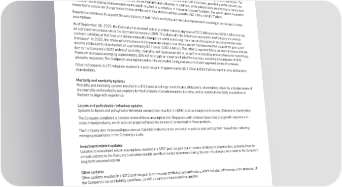 Long-term care triennial review U.S. Insurance completed a comprehensive long-term care (“LTC”) experience study. The review included all aspects of claim assumptions, as well as the progress on future premium rate increases. The impact of the LTC review resulted in a net $15 post-tax charge to net income attributed to shareholders. The experience study showed that claim costs established in the last triennial review remain appropriate in aggregate for the older blocks 1 supported by robust claims data on this mature block. Insurance contract liabilities were strengthened for claim costs on the of business 2 3 newer block of business . This was driven by lower active life mortality supported by Company experience and a recent industry study, as well as higher utilization of benefits, which included the impact of reflecting higher inflation in the cost-of-care up to the current year. The Company also reviewed and updated incidence and claim termination assumptions which, on a net basis, provided a partial offset to the increase in insurance contract liabilities on active life mortality and utilization. In addition, some policyholders are electing to reduce their benefits in lieu of paying increased premiums which resulted in a reduction in insurance contract liabilities. The overall claims experience review led to a post-tax charge to net income attributed to shareholders of approximately $2.3 billion (US$1.7 billion). Experience continues to support the assumptions of both future morbidity and mortality improvement, resulting in no changes to these assumptions. As of September 30, 2022, the Company has received actual premium increase approvals of $2.5 billion pre-tax (US$1.9 billion pre-tax) on a present value basis since the last triennial review in 2019. This aligns with the full amount assumed in the Company’s insurance contract liabilities at that time and demonstrates the Company’s continued strong track record of progress in securing premium rate 4 increases . In 2022, the review of future premium increases assumed in insurance contract liabilities resulted in a post-tax gain to net income attributed to shareholders of approximately $2.1 billion (US$1.6 billion). This reflects expected future premium increases that are due to the Company’s 2022 review of morbidity, mortality, and lapse assumptions, as well as outstanding amounts from prior state filings. Premium increases averaging approximately 30% will be sought on about one-half of the business, excluding the carryover of 2019 amounts requested. The Company’s assumptions reflect the estimated timing and amount of state approved premium increases. Other refinements to LTC valuation resulted in a post-tax gain of approximately $0.2 billion (US$0.2 billion) to net income attributed to shareholders. Mortality and morbidity updates Mortality and morbidity updates resulted in a $126 post-tax charge to net income attributed to shareholders, driven by a detailed review of the mortality and morbidity assumptions for the Company’s Canada insurance business, and by updates to morbidity assumptions in Vietnam to align with experience. Lapses and policyholder behaviour updates Updates to lapses and policyholder behaviour assumptions resulted in a $192 post-tax charge to net income attributed to shareholders. The Company completed a detailed review of lapse assumptions for Singapore, and increased lapse rates to align with experience on index-linked products, which reduced projected future fee income to be received on these products. The Company also increased lapse rates on Canada’s term insurance products for policies approaching their renewal date, reflecting emerging experience in the Company’s study. Investment-related updates Updates to investment return assumptions resulted in a $157 post-tax gain to net income attributed to shareholders, primarily driven by annual updates to the Company’s valuation models to reflect market movements during the year. No changes were made to the Company’s long-term assumed returns. Other updates Other updates resulted in a $212 post-tax gain to net income attributed to shareholders, which included refinements to the projection of the Company’s tax and liability cash flows, as well as various other modelling updates. 1 First generation policies issued prior to 2002. 2 Second generation policies with an average issue date of 2007 and Group policies with an average issue date of 2003. 3 The mortality rate of LTC policyholders who are currently not on claim. 4 Actual experience obtaining premium increases could be materially different than what the Company has assumed, resulting in further increases or decreases in insurance contract liabilities, which could be material. 183
