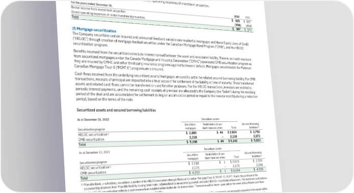 (d) Investmentexpenses The following table presents total investment expenses. For the years ended December 31, 2022 2021 Related to invested assets $ 718 $ 633 Related to segregated, mutual and other funds 1,145 1,347 Total investment expenses $ 1,863 $ 1,980 (e) Investmentproperties The following table presents the rental income and direct operating expenses of investment properties. For the years ended December 31, 2022 2021 Rental income from investment properties $ 825 $ 837 Direct operating expenses of rental investment properties (458) (464) Total $ 367 $ 373 (f) Mortgagesecuritization The Company securitizes certain insured and uninsured fixed and variable rate residential mortgages and Home Equity Lines of Credit (“HELOC”) through creation of mortgage-backed securities under the Canadian Mortgage Bond Program (“CMB”), and the HELOC securitization program. Benefits received from the securitization include interest spread between the asset and associated liability. There is no credit exposure from securitized mortgages under the Canada Mortgage and Housing Corporation (“CMHC”) sponsored CMB securitization program as they are insured by CMHC and other third-party insurance programs against borrowers’ default. Mortgages securitized in the Platinum Canadian Mortgage Trust II (“PCMT II”) program are uninsured. Cash flows received from the underlying securitized assets/mortgages are used to settle the related secured borrowing liability. For CMB transactions, receipts of principal are deposited into a trust account for settlement of the liability at time of maturity. These transferred assets and related cash flows cannot be transferred or used for other purposes. For the HELOC transactions, investors are entitled to periodic interest payments, and the remaining cash receipts of principal are allocated to the Company (the “Seller”) during the revolving period of the deal and are accumulated for settlement during an accumulation period or repaid to the investor monthly during a reduction period, based on the terms of the note. Securitized assets and secured borrowing liabilities As at December 31, 2022 Securitized assets Securitized Restricted cash and Secured borrowing (2) Securitization program mortgages short-term securities Total liabilities (1) HELOC securitization $ 2,880 $ 44 $2,924 $ 2,750 CMB securitization 2,318 – 2,318 2,273 Total $ 5,198 $ 44 $5,242 $ 5,023 As at December 31, 2021 Securitized assets Securitized Restricted cash and Secured borrowing (2) Securitization program mortgages short-term securities Total liabilities (1) HELOC securitization $ 2,618 $ 1 $ 2,619 $ 2,500 CMB securitization 2,075 – 2,075 2,098 Total $ 4,693 $ 1 $ 4,694 $ 4,598 (1) Manulife Bank, a subsidiary, securitizes a portion of its HELOC receivables through Platinum Canadian Mortgage Trust II (“PCMT II”). PCMT II funds the purchase of the co-ownership interests from Manulife Bank by issuing term notes collateralized by an underlying pool of uninsured HELOCs to institutional investors. The restricted cash balance for the HELOC securitization reflects a cash reserve fund established in relation to the transactions. The reserve will be drawn upon only in the event of insufficient cash flows from the underlying HELOCs to satisfy the secured borrowing liability. (2) The PCMT II notes payable have floating rates of interest and are secured by the PCMT II assets. Under the terms of the agreements, no principal is expected to be repaid within one year, $1,209 within 1-3 years, $1,049 within 3-5 years and $492 beyond 5 years. There is no specific maturity date for the contractual agreements. Under the terms of the notes, additional collateral must be provided to the series as added credit protection and the Series Purchase Agreements govern the amount of over-collateralization for each of the term notes outstanding. Manulife Bank also securitizes insured amortizing mortgages under the National Housing Act Mortgage-Backed Securities (“NHA MBS”) program sponsored by CMHC. Manulife Bank participates in CMB programs by selling NHA MBS securities to Canada Housing Trust (“CHT”), as a source of fixed rate funding. As at December 31, 2022, the fair value of securitized assets and associated liabilities were $5,167 and $4,865, respectively (2021 – $4,725 and $4,601). 164 | 2022AnnualReport | NotestoConsolidatedFinancialStatements