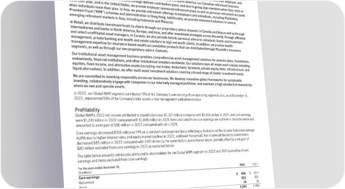 5. Global Wealth and Asset Management Our Global Wealth and Asset Management segment, branded as Manulife Investment Management, provides investment advice and innovative solutions to retirement, retail and institutional clients. Our leading capabilities in public and private markets are 1 strengthened by an investment footprint that spans 19 geographies , including 10 in Asia with over 120 years of on-the-ground experience. In Retirement, we provide financial guidance, advice, investment solutions and recordkeeping services to over 8 million plan participants and rollover individuals in North America and Asia while they are in the accumulation phase with their employer, and increasingly as they prepare for retirement outside their employer’s plan. In North America, our Canadian retirement business focuses on providing retirement solutions through defined contribution plans, and also to group plan members when they retire or leave their plan; and in the United States, we provide employer sponsored retirement plans as well as personal retirement accounts when individuals leave their plan. In Asia, we provide retirement offerings to employers and individuals, including Mandatory Provident Fund (“MPF”) schemes and administration in Hong Kong. Additionally, we provide retirement solutions in several emerging retirement markets in Asia, including Indonesia and Malaysia. In Retail, we distribute investment funds to clients through our proprietary advice channels in Canada and Asia as well as through intermediaries and banks in North America, Europe, and Asia, and offer investment strategies across the world, through affiliated and select unaffiliated asset managers. In Canada, we also provide holistic personal advice to individual clients and investment management, private banking and wealth and estate solutions to high-net-worth clients. In addition, we provide wealth management expertise for insurance-based wealth accumulation products that are distributed through Manulife’s insurance segments, as well as through our own proprietary advice channels. Our institutional asset management business provides comprehensive asset management solutions for pension plans, foundations, endowments, financial institutions, and other institutional investors worldwide. Our solutions span all major asset classes including equities, fixed income, and alternative assets (including real estate, timberland, farmland, private equity/debt, infrastructure, and liquid alternatives). In addition, we offer multi-asset investment solutions covering a broad range of clients’ investment needs. We are committed to investing responsibly across our businesses. We develop innovative global frameworks for sustainable investing, collaboratively engage with companies in our internally managed portfolios, and maintain a high standard of stewardship where we own and operate assets. In 2022, our Global WAM segment contributed 19% of the Company’s core earnings from operating segments and, as at December 31, 2022, represented 59% of the Company’s total assets under management and administration. Profitability Global WAM’s 2022 net income attributed to shareholders was $1,321 million compared with $1,406 million in 2021, and core earnings were $1,241 million in 2022 compared with $1,406 million in 2021. Items excluded from core earnings are outlined in the table below and amounted to a net gain of $80 million in 2022 compared with nil in 2021. Core earnings decreased $165 million or 14% on a constant exchange rate basis reflecting a decline in net fee income from lower average AUMA due to higher interest rates and equity market declines in 2022, and lower fee spread. Net income attributed to shareholders decreased $85 million in 2022 compared with 2021 driven by the same factors as mentioned above, partially offset by a net gain of $80 million excluded from core earnings in 2022 as explained below. The table below presents net income attributed to shareholders for the Global WAM segment for 2022 and 2021 consisting of core earnings and items excluded from core earnings. For the years ended December 31, ($ millions) 2022 2021 Coreearnings Retirement $ 699 $ 819 Retail 523 551 Institutional 19 36 Coreearnings 1,241 1,406 Itemsexcludedfromcoreearnings: (1) Reinsurance transactions, tax-related items and other 80 – Netincomeattributedtoshareholders $ 1,321 $ 1,406 (1) The net gain of $80 million includes a net gain of $86 million related to acquiring full ownership interest of MTEDA by purchasing the remaining 51% of shares from our joint venture partner, partially offset by a $6 million charge related to an increase in the Canadian corporate tax rate. 1 United States, Canada, Japan, Hong Kong, Singapore, Taiwan, Indonesia, Vietnam, Malaysia, India, the Philippines, England, Ireland, Switzerland, Germany, and mainland China. In addition, we have timberland/farmland operations in Australia, New Zealand, and Chile. 32 | 2022AnnualReport | Management’sDiscussionandAnalysis
