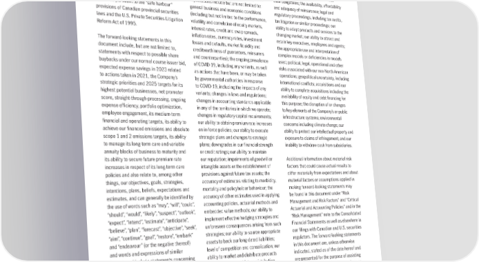 Caution regarding forward-looking statements From time to time, Manulife Financial Certain material factors or assumptions are obligations to pledge additional collateral; Corporation (“MFC”) makes written and/ applied in making forward-looking statements the availability of letters of credit to provide or oral forward-looking statements, and actual results may differ materially capital management flexibility; accuracy of including in this document. In addition, our from those expressed or implied in such information received from counterparties representatives may make forward-looking statements. Important factors that could and the ability of counterparties to meet statements orally to analysts, investors, cause actual results to differ materially from their obligations; the availability, affordability the media and others. All such statements expectations include but are not limited to: and adequacy of reinsurance; legal and are made pursuant to the “safe harbour” general business and economic conditions regulatory proceedings, including tax audits, provisions of Canadian provincial securities (including but not limited to the performance, tax litigation or similar proceedings; our laws and the U.S. Private Securities Litigation volatility and correlation of equity markets, ability to adapt products and services to the Reform Act of 1995. interest rates, credit and swap spreads, changing market; our ability to attract and inflation rates, currency rates, investment retain key executives, employees and agents; The forward-looking statements in this losses and defaults, market liquidity and the appropriate use and interpretation of document include, but are not limited to, creditworthiness of guarantors, reinsurers complex models or deficiencies in models statements with respect to possible share and counterparties); the ongoing prevalence used; political, legal, operational and other buybacks under our normal course issuer bid, of COVID-19, including any variants, as well risks associated with our non-North American expected expense savings in 2023 related as actions that have been, or may be taken operations; geopolitical uncertainty, including to actions taken in 2021, the Company’s by governmental authorities in response international conflicts; acquisitions and our strategic priorities and 2025 targets for its to COVID-19, including the impacts of any ability to complete acquisitions including the highest potential businesses, net promoter variants; changes in laws and regulations; availability of equity and debt financing for score, straight-through-processing, ongoing changes in accounting standards applicable this purpose; the disruption of or changes expense efficiency, portfolio optimization, in any of the territories in which we operate; to key elements of the Company’s or public employee engagement, its medium-term changes in regulatory capital requirements; infrastructure systems; environmental financial and operating targets, its ability to our ability to obtain premium rate increases concerns including climate change; our achieve our financed emissions and absolute on in-force policies; our ability to execute ability to protect our intellectual property and scope 1 and 2 emissions targets, its ability strategic plans and changes to strategic exposure to claims of infringement; and our to manage its long-term care and variable plans; downgrades in our financial strength inability to withdraw cash from subsidiaries. annuity blocks of business to maturity and or credit ratings; our ability to maintain its ability to secure future premium rate our reputation; impairments of goodwill or Additional information about material risk increases in respect of its long-term care intangible assets or the establishment of factors that could cause actual results to policies and also relate to, among other provisions against future tax assets; the differ materially from expectations and about things, our objectives, goals, strategies, accuracy of estimates relating to morbidity, material factors or assumptions applied in intentions, plans, beliefs, expectations and mortality and policyholder behaviour; the making forward-looking statements may estimates, and can generally be identified by accuracy of other estimates used in applying be found in this document under “Risk the use of words such as “may”, “will”, “could”, accounting policies, actuarial methods and Management and Risk Factors” and “Critical “should”, “would”, “likely”, “suspect”, “outlook”, embedded value methods; our ability to Actuarial and Accounting Policies” and in the “expect”, “intend”, “estimate”, “anticipate”, implement effective hedging strategies and “Risk Management” note to the Consolidated “believe”, “plan”, “forecast”, “objective”, “seek”, unforeseen consequences arising from such Financial Statements as well as elsewhere in “aim”, “continue”, “goal”, “restore”, “embark” strategies; our ability to source appropriate our filings with Canadian and U.S. securities and “endeavour” (or the negative thereof) assets to back our long-dated liabilities; regulators. The forward-looking statements and words and expressions of similar level of competition and consolidation; our in this document are, unless otherwise import, and include statements concerning ability to market and distribute products indicated, stated as of the date hereof and possible or assumed future results. Although through current and future distribution are presented for the purpose of assisting we believe that the expectations reflected channels; unforeseen liabilities or asset investors and others in understanding our in such forward-looking statements are impairments arising from acquisitions and financial position and results of operations, reasonable, such statements involve risks dispositions of businesses; the realization of our fu