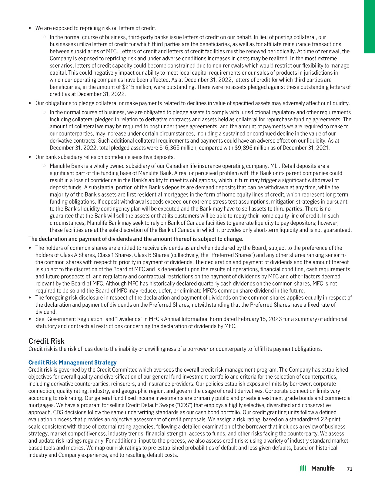 • We are exposed to repricing risk on letters of credit. O In the normal course of business, third-party banks issue letters of credit on our behalf. In lieu of posting collateral, our businesses utilize letters of credit for which third parties are the beneficiaries, as well as for affiliate reinsurance transactions between subsidiaries of MFC. Letters of credit and letters of credit facilities must be renewed periodically. At time of renewal, the Company is exposed to repricing risk and under adverse conditions increases in costs may be realized. In the most extreme scenarios, letters of credit capacity could become constrained due to non-renewals which would restrict our flexibility to manage capital. This could negatively impact our ability to meet local capital requirements or our sales of products in jurisdictions in which our operating companies have been affected. As at December 31, 2022, letters of credit for which third parties are beneficiaries, in the amount of $215 million, were outstanding. There were no assets pledged against these outstanding letters of credit as at December 31, 2022. • Our obligations to pledge collateral or make payments related to declines in value of specified assets may adversely affect our liquidity. O In the normal course of business, we are obligated to pledge assets to comply with jurisdictional regulatory and other requirements including collateral pledged in relation to derivative contracts and assets held as collateral for repurchase funding agreements. The amount of collateral we may be required to post under these agreements, and the amount of payments we are required to make to our counterparties, may increase under certain circumstances, including a sustained or continued decline in the value of our derivative contracts. Such additional collateral requirements and payments could have an adverse effect on our liquidity. As at December 31, 2022, total pledged assets were $16,365 million, compared with $9,896 million as of December 31, 2021. • Our bank subsidiary relies on confidence sensitive deposits. O Manulife Bank is a wholly owned subsidiary of our Canadian life insurance operating company, MLI. Retail deposits are a significant part of the funding base of Manulife Bank. A real or perceived problem with the Bank or its parent companies could result in a loss of confidence in the Bank’s ability to meet its obligations, which in turn may trigger a significant withdrawal of deposit funds. A substantial portion of the Bank’s deposits are demand deposits that can be withdrawn at any time, while the majority of the Bank’s assets are first residential mortgages in the form of home equity lines of credit, which represent long-term funding obligations. If deposit withdrawal speeds exceed our extreme stress test assumptions, mitigation strategies in pursuant to the Bank’s liquidity contingency plan will be executed and the Bank may have to sell assets to third parties. There is no guarantee that the Bank will sell the assets or that its customers will be able to repay their home equity line of credit. In such circumstances, Manulife Bank may seek to rely on Bank of Canada facilities to generate liquidity to pay depositors; however, these facilities are at the sole discretion of the Bank of Canada in which it provides only short-term liquidity and is not guaranteed. The declaration and payment of dividends and the amount thereof is subject to change. • The holders of common shares are entitled to receive dividends as and when declared by the Board, subject to the preference of the holders of Class A Shares, Class 1 Shares, Class B Shares (collectively, the “Preferred Shares”) and any other shares ranking senior to the common shares with respect to priority in payment of dividends. The declaration and payment of dividends and the amount thereof is subject to the discretion of the Board of MFC and is dependent upon the results of operations, financial condition, cash requirements and future prospects of, and regulatory and contractual restrictions on the payment of dividends by MFC and other factors deemed relevant by the Board of MFC. Although MFC has historically declared quarterly cash dividends on the common shares, MFC is not required to do so and the Board of MFC may reduce, defer, or eliminate MFC’s common share dividend in the future. • The foregoing risk disclosure in respect of the declaration and payment of dividends on the common shares applies equally in respect of the declaration and payment of dividends on the Preferred Shares, notwithstanding that the Preferred Shares have a fixed rate of dividend. • See “Government Regulation” and “Dividends” in MFC’s Annual Information Form dated February 15, 2023 for a summary of additional statutory and contractual restrictions concerning the declaration of dividends by MFC. Credit Risk Credit risk is the risk of loss due to the inability or unwillingness of a borrower or counterparty to fulfill its payment obligations. CreditRiskManagementStrategy Credit risk is governed by the Credit Committee which oversees the overall credit risk management program. The Company has established objectives for overall quality and diversification of our general fund investment portfolio and criteria for the selection of counterparties, including derivative counterparties, reinsurers, and insurance providers. Our policies establish exposure limits by borrower, corporate connection, quality rating, industry, and geographic region, and govern the usage of credit derivatives. Corporate connection limits vary according to risk rating. Our general fund fixed income investments are primarily public and private investment grade bonds and commercial mortgages. We have a program for selling Credit Default Swaps (“CDS”) that employs a highly selective, diversified and conservative approach. CDS decisions follow the same underwriting standards as our cash bond portfolio. Our credit gr