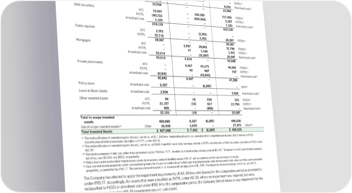 The following table presents invested assets by type and measurement category as at December 31, 2021, with transitional measurement differences and presentation differences and then invested assets by type and category as at January 1, 2022. Impact of IFRS 17 December 31, 2021 Amendments January 1, 2022 IAS 39 Measurement Total carrying Measurement Presentation Total carrying Measurement Category value Differences Differences value Category (1) Cash and short-term securities AFS $ 14,339 $ – $ 2,214 $ 16,553 FVOCI (2) FVTPL 2,214 – (2,214) – FVTPL (3) Amortized cost 6,041 – – 6,041 Amortized cost 22,594 – – 22,594 (1) Debt securities AFS 33,097 – 184,365 217,462 FVOCI (2) FVTPL 189,722 – (184,365) 5,357 FVTPL (3) Amortized cost 1,320 – – 1,320 Amortized cost 224,139 – – 224,139 Public equities AFS 2,351 – (2,351) – (2) FVTPL 25,716 – 2,351 28,067 FVTPL 28,067 – – 28,067 (1) Mortgages AFS – 1,897 29,901 31,798 FVOCI (2) FVTPL – 37 1,166 1,203 FVTPL (3) Amortized cost 52,014 – (31,067) 20,947 Amortized cost 52,014 1,934 – 53,948 (1) Private placements AFS – 4,407 42,175 46,582 FVOCI (2) FVTPL – 40 667 707 FVTPL (3) Amortized cost 42,842 – (42,842) – Amortized cost 42,842 4,447 – 47,289 (4) Policy loans Amortized cost 6,397 – (6,397) – N/A (3) Loans to Bank clients Amortized cost 2,506 – – 2,506 Amortized cost (1) Other invested assets AFS 89 (4) 238 323 FVOCI (2) FVTPL 21,157 (10) 617 21,764 FVTPL (3) Amortized cost 855 – (855) – Amortized cost 22,101 (14) – 22,087 Totalin-scopeinvested assets 400,660 6,367 (6,397) 400,630 (5) (5) Out-of-scope invested assets Other 26,438 1,035 – 27,473 Other TotalInvestedAssets $ 427,098 $ 7,402 $ (6,397) $ 428,103 (1) The reclassification of unrealized gains (losses), net of tax, of $11,868 from retained earnings to accumulated other comprehensive income (AOCI) related to FVOCI classification of debt investments classified as FVTPL under IAS 39. (2) The reclassification of unrealized gains (losses), net of tax, of $268 from AOCI to retained earnings related to FVTPL classification of debt securities classified as FVOCI under IAS 39. (3) The remeasurement of debt securities from amortized cost to FVOCI or FVTPL resulted in an increase in carrying value of $6,367. The impact on AOCI and retained earnings, net of tax, was $5,041 and $952, respectively. (4) Policy loans were reclassified from invested assets to insurance contract liabilities under IFRS 17 with no remeasurement and no impact to equity. (5) Own use real estate properties which are underlying items for insurance contracts with direct participating features were remeasured to fair value as if they were investment properties, as permitted by IFRS 17. This remeasurement resulted in an increase of carrying value of $1,035. The impact to retained earnings, net of tax, was $915. The Company has elected to apply the impairment requirements of IAS 39 (incurred losses) for the comparative period as provided for under IFRS 17. Accordingly, for assets that were classified as FVTPL under IAS 39, where no impairment was required, but were reclassified to FVOCI or amortized cost under IFRS 9 for the comparative period, the Company did not measure any impairment for the comparative period since IAS 39 impairment was not calculated. 157