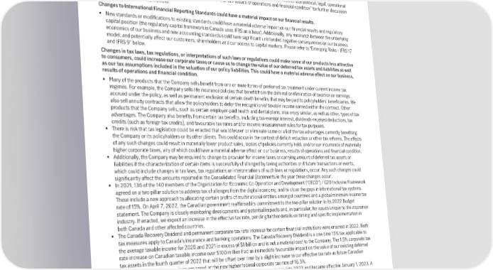 the suspension of individual employees, limitations on engaging in certain lines of business for specified periods of time, revocation of investment advisor and other registrations and censures and fines both for individuals and Manulife, along with the resulting damage to our reputation. • From time to time, regulators raise issues during examinations or audits of Manulife that could have a material adverse impact on us. We cannot predict whether or when regulatory actions may be taken that could adversely affect our operations. Our failure to comply with existing and evolving regulatory requirements could also result in regulatory sanctions and could affect our relationships with regulatory authorities and our ability to execute our business strategies and plans. For further discussion of government regulation and legal proceedings refer to “Government Regulation” in MFC’s Annual Information Form dated February 15, 2023 and note 19 of the 2022 Annual Consolidated Financial Statements. See also “Operational Risk Factors – Our operations face political, legal, operational and other risks that could negatively affect those operations or our results of operations and financial condition” for further discussion on the impact to our operations. Changes to International Financial Reporting Standards could have a material impact on our financial results. • New standards or modifications to existing standards could have a material adverse impact on our financial results and regulatory capital position (the regulatory capital framework in Canada uses IFRS as a base). Additionally, any mismatch between the underlying economics of our business and new accounting standards could have significant unintended negative consequences on our business model; and potentially affect our customers, shareholders and our access to capital markets. Please refer to “Emerging Risks – IFRS 17 and IFRS 9” below. Changes in tax laws, tax regulations, or interpretations of such laws or regulations could make some of our products less attractive to consumers, could increase our corporate taxes or cause us to change the value of our deferred tax assets and liabilities as well as our tax assumptions included in the valuation of our policy liabilities. This could have a material adverse effect on our business, results of operations and financial condition. • Many of the products that the Company sells benefit from one or more forms of preferred tax treatment under current income tax regimes. For example, the Company sells life insurance policies that benefit from the deferral or elimination of taxation on earnings accrued under the policy, as well as permanent exclusion of certain death benefits that may be paid to policyholders’ beneficiaries. We also sell annuity contracts that allow the policyholders to defer the recognition of taxable income earned within the contract. Other products that the Company sells, such as certain employer-paid health and dental plans, also enjoy similar, as well as other, types of tax advantages. The Company also benefits from certain tax benefits, including tax-exempt interest, dividends-received deductions, tax credits (such as foreign tax credits), and favourable tax rates and/or income measurement rules for tax purposes. • There is risk that tax legislation could be enacted that would lessen or eliminate some or all of the tax advantages currently benefiting the Company or its policyholders or its other clients. This could occur in the context of deficit reduction or other tax reforms. The effects of any such changes could result in materially lower product sales, lapses of policies currently held, and/or our incurrence of materially higher corporate taxes, any of which could have a material adverse effect on our business, results of operations and financial condition. • Additionally, the Company may be required to change its provision for income taxes or carrying amount of deferred tax assets or liabilities if the characterization of certain items is successfully challenged by taxing authorities or if future transactions or events, which could include changes in tax laws, tax regulations or interpretations of such laws or regulations, occur. Any such changes could significantly affect the amounts reported in the Consolidated Financial Statements in the year these changes occur. • In 2021, 136 of the 140 members of the Organization for Economic Co-Operation and Development (“OECD”) / G20 Inclusive Framework agreed on a two-pillar solution to address tax challenges from the digital economy, and to close the gaps in international tax systems. These include a new approach to allocating certain profits of multinational entities amongst countries and a global minimum income tax rate of 15%. On April 7, 2022, the Canadian government reaffirmed its commitment to the two-pillar solution in its 2022 Budget statement. The Company is closely monitoring developments and potential impacts and, in particular, for issues unique to the insurance industry. If enacted, we expect an increase in the effective tax rate, pending further details on timing and specific implementation in both Canada and other affected countries. • The Canada Recovery Dividend and permanent corporate tax rate increase for certain financial institutions were enacted in 2022. Both tax measures apply to Canada’s insurance and banking operations. The Canada Recovery Dividend is a one-time 15% tax applicable to the average taxable income for 2020 and 2021 in excess of $1 billion and is not a material cost to the Company. The 1.5% corporate tax rate increase on Canadian taxable income over $100 million had an immediate favourable impact on the value of our existing deferred tax assets in the fourth quarter of 2022 that will be offset over time by a slight increase to our effective tax rate as future Canadian insurance and banking earnings are taxed at the new higher federal corporate tax rate of 