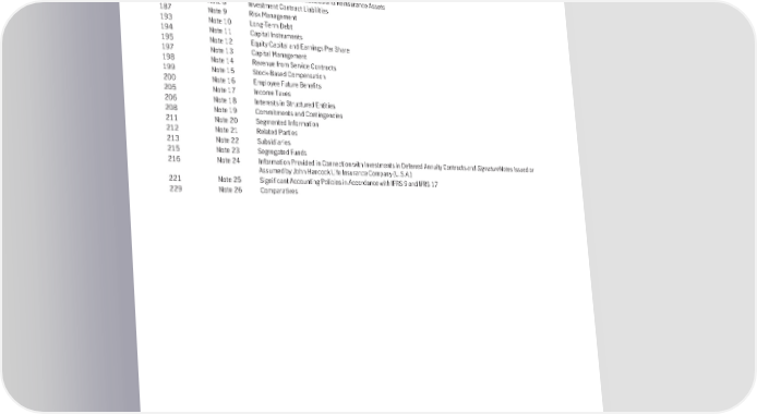 NotestoConsolidatedFinancialStatements PageNumber Note 146 Note 1 Nature of Operations and Significant Accounting Policies 154 Note 2 Accounting and Reporting Changes 160 Note 3 Acquisitions 160 Note 4 Invested Assets and Investment Income 168 Note 5 Derivative and Hedging Instruments 174 Note 6 Goodwill and Intangible Assets 176 Note 7 Insurance Contract Liabilities and Reinsurance Assets 185 Note 8 Investment Contract Liabilities 187 Note 9 Risk Management 193 Note 10 Long-Term Debt 194 Note 11 Capital Instruments 195 Note 12 Equity Capital and Earnings Per Share 197 Note 13 Capital Management 198 Note 14 Revenue from Service Contracts 199 Note 15 Stock-Based Compensation 200 Note 16 Employee Future Benefits 205 Note 17 Income Taxes 206 Note 18 Interests in Structured Entities 208 Note 19 Commitments and Contingencies 211 Note 20 Segmented Information 212 Note 21 Related Parties 213 Note 22 Subsidiaries 215 Note 23 Segregated Funds 216 Note 24 Information Provided in Connection with Investments in Deferred Annuity Contracts and SignatureNotes Issued or Assumed by John Hancock Life Insurance Company (U.S.A.) 221 Note 25 Significant Accounting Policies in Accordance with IFRS 9 and IFRS 17 229 Note 26 Comparatives 145