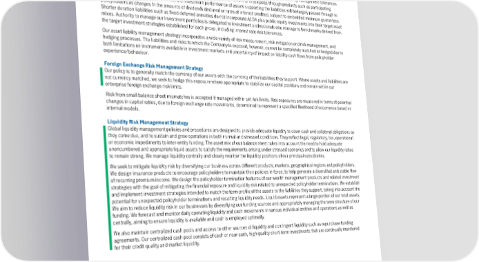 managed to a benchmark developed to minimize interest rate risk against the liability cash flows. Utilizing ALDA and public equity investments provides a suitable match for long-duration liabilities that also enhances long-term investment returns and reduces aggregate risk through diversification. For insurance and annuity products where significant pass-through features exist, a total return strategy approach is used, generally combining fixed income with ALDA plus public equity investments. ALDA and public equity may be included to enhance long-term investment returns and reduce aggregate risk through diversification. Target investment strategies are established using portfolio analysis techniques that seek to optimize long-term investment returns while considering the risks related to embedded product guarantees and policyholder withdrawal options, the impact of regulatory and economic capital requirements and considering management tolerances with respect to short-term income volatility and long-term tail risk exposure. For these pass-through products such as participating insurance and universal life insurance, the investment performance of assets supporting the liabilities will be largely passed through to policyholders as changes in the amounts of dividends declared or rates of interest credited, subject to embedded minimum guarantees. Shorter duration liabilities such as fixed deferred annuities do not incorporate ALDA plus public equity investments into their target asset mixes. Authority to manage our investment portfolios is delegated to investment professionals who manage to benchmarks derived from the target investment strategies established for each group, including interest rate risk tolerances. Our asset liability management strategy incorporates a wide variety of risk measurement, risk mitigation and risk management, and hedging processes. The liabilities and risks to which the Company is exposed, however, cannot be completely matched or hedged due to both limitations on instruments available in investment markets and uncertainty of impact on liability cash flows from policyholder experience/behaviour. ForeignExchangeRiskManagementStrategy Our policy is to generally match the currency of our assets with the currency of the liabilities they support. Where assets and liabilities are not currency matched, we seek to hedge this exposure where appropriate to stabilize our capital positions and remain within our enterprise foreign exchange risk limits. Risk from small balance sheet mismatches is accepted if managed within set risk limits. Risk exposures are measured in terms of potential changes in capital ratios, due to foreign exchange rate movements, determined to represent a specified likelihood of occurrence based on internal models. LiquidityRiskManagementStrategy Global liquidity management policies and procedures are designed to provide adequate liquidity to cover cash and collateral obligations as they come due, and to sustain and grow operations in both normal and stressed conditions. They reflect legal, regulatory, tax, operational or economic impediments to inter-entity funding. The asset mix of our balance sheet takes into account the need to hold adequate unencumbered and appropriate liquid assets to satisfy the requirements arising under stressed scenarios and to allow our liquidity ratios to remain strong. We manage liquidity centrally and closely monitor the liquidity positions of our principal subsidiaries. We seek to mitigate liquidity risk by diversifying our business across different products, markets, geographical regions and policyholders. We design insurance products to encourage policyholders to maintain their policies in-force, to help generate a diversified and stable flow of recurring premium income. We design the policyholder termination features of our wealth management products and related investment strategies with the goal of mitigating the financial exposure and liquidity risk related to unexpected policyholder terminations. We establish and implement investment strategies intended to match the term profile of the assets to the liabilities they support, taking into account the potential for unexpected policyholder terminations and resulting liquidity needs. Liquid assets represent a large portion of our total assets. We aim to reduce liquidity risk in our businesses by diversifying our funding sources and appropriately managing the term structure of our funding. We forecast and monitor daily operating liquidity and cash movements in various individual entities and operations as well as centrally, aiming to ensure liquidity is available and cash is employed optimally. We also maintain centralized cash pools and access to other sources of liquidity and contingent liquidity such as repurchase funding agreements. Our centralized cash pool consists of cash or near-cash, high quality short-term investments that are continually monitored for their credit quality and market liquidity. 61