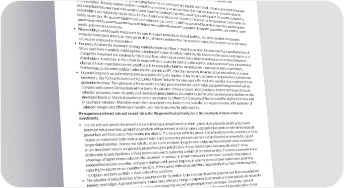 MarketRiskFactors Our most significant source of publicly traded equity risk arises from equity-linked products with guarantees, where the guarantees are linked to the performance of the underlying funds. • Publicly traded equity performance risk arises from a variety of sources, including guarantees associated with equity-linked investments such as variable annuity and segregated fund products, general fund investments in publicly traded equities and mutual funds backing general fund product liabilities. • Market conditions resulting in reductions in the asset value we manage has an adverse effect on the revenues and profitability of our investment management business, which depends on fees related primarily to the values of assets under management and administration. • Guaranteed benefits of variable annuity and segregated funds are contingent and payable upon death, maturity, permitted withdrawal or annuitization. If equity markets decline or even if they increase by an amount lower than that assumed in our actuarial valuation, additional liabilities may need to be established to cover the contingent liabilities, resulting in a reduction in net income attributed to shareholders and regulatory capital ratios. Further, if equity markets do not recover to the amount of the guarantees, by the dates the liabilities are due, the accrued liabilities will need to be paid out in cash. In addition, sustained flat or declining public equity markets would likely reduce asset-based fee revenues related to variable annuities and segregated funds with guarantees and related to other wealth and insurance products. • Where publicly traded equity investments are used to support general fund product liabilities, the policy valuation incorporates projected investment returns on these assets. If actual returns are lower than the expected returns, the investment losses will reduce net income attributed to shareholders. • For products where the investment strategy applied to future cash flows in the policy valuation includes investing a specified portion of future cash flows in publicly traded equities, a decline in the value of publicly traded equities relative to other assets could require us to change the investment mix assumed for future cash flows, which may increase policy liabilities and reduce net income attributed to shareholders. A reduction in the outlook for expected future returns for publicly traded equities, which could result from a fundamental change in future expected economic growth, would increase policy liabilities and reduce net income attributed to shareholders. Furthermore, to the extent publicly traded equities are held as AFS, other than temporary impairments that arise will reduce income. • Expected long-term annual market growth assumptions for public equities for key markets are based on long-term historical observed experience. See “Critical Actuarial and Accounting Policies” below for the rates used in the stochastic valuation of our segregated fund guarantee business. The calibration of the economic scenario generators that are used to value segregated fund guarantee business complies with current CIA Standards of Practice for the valuation of these products. Implicit margins, determined through stochastic valuation processes, lower net yields used to establish policy liabilities. Assumptions used for public equities backing liabilities are also developed based on historical experience but are constrained by different CIA Standards of Practice and differ slightly from those used in stochastic valuation. Alternative asset return assumptions vary based on asset class but are largely consistent, after application of valuation margins and differences in taxation, with returns assumed for public equities. We experience interest rate and spread risk within the general fund primarily due to the uncertainty of future returns on investments. • Interest rate and spread risk arises from general fund guaranteed benefit products, general fund adjustable benefit products with minimum rate guarantees, general fund products with guaranteed surrender values, segregated fund products with minimum benefit guarantees and from surplus fixed income investments. The risk arises within the general fund primarily due to the uncertainty of future returns on investments to be made as assets mature and as recurring premiums are received and invested or reinvested to support longer dated liabilities. Interest rate risk also arises due to minimum rate guarantees and guaranteed surrender values on products where investment returns are generally passed through to policyholders. A rapid rise in interest rates may also result in losses attributable to early liquidation of fixed income instruments supporting contractual surrender benefits, if customers surrender to take advantage of higher interest rates on offer elsewhere. In contrast, in a lower interest rate environment, borrowers may prepay or redeem fixed income securities, mortgages and loans with greater frequency in order to borrow at lower market rates, potentially reducing the returns on our investment portfolio, if there are no make whole conditions. Substantially all our fixed income securities, mortgages and loans portfolio include make whole conditions. • The valuation of policy liabilities reflects assumptions for the yield on future investments and the projected cash flows associated with interest rate hedges. A general decline in interest rates, without a change in corporate bond spreads and swap spreads, will reduce the assumed yield on future investments but favourably impact the value of lengthening interest rate hedges. Conversely, a general increase in interest rates, without a change in corporate bond spreads and swap spreads, will increase the assumed yield on future investments, but unfavourably impact the value of lengthening interest rate hedges. The Company’s disclosed estimated impact from interest rate moveme
