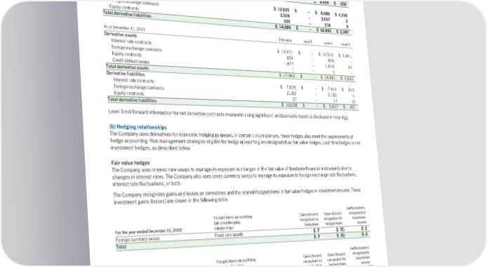 Fair value and the fair value hierarchy of derivative instruments As at December 31, 2022 Fair value Level 1 Level 2 Level 3 Derivative assets Interest rate contracts $ 5,919 $ – $ 5,766 $ 153 Foreign exchange contracts 2,299 – 2,298 1 Equity contracts 366 – 361 5 Credit default swaps 4 – 4 – Total derivative assets $ 8,588 $ – $ 8,429 $ 159 Derivative liabilities Interest rate contracts $ 12,025 $ – $ 8,689 $ 3,336 Foreign exchange contracts 2,039 – 2,037 2 Equity contracts 225 – 216 9 Total derivative liabilities $ 14,289 $ – $ 10,942 $ 3,347 As at December 31, 2021 Fair value Level 1 Level 2 Level 3 Derivative assets Interest rate contracts $ 14,971 $ – $ 12,510 $ 2,461 Foreign exchange contracts 854 – 854 – Equity contracts 1,677 – 1,616 61 Credit default swaps 1 – 1 – Total derivative assets $ 17,503 $ – $ 14,981 $ 2,522 Derivative liabilities Interest rate contracts $ 7,829 $ – $ 7,419 $ 410 Foreign exchange contracts 2,182 – 2,181 1 Equity contracts 27 – 17 10 Total derivative liabilities $ 10,038 $ – $ 9,617 $ 421 Level 3 roll forward information for net derivative contracts measured using significant unobservable inputs is disclosed in note 4(g). (b) Hedgingrelationships The Company uses derivatives for economic hedging purposes. In certain circumstances, these hedges also meet the requirements of hedge accounting. Risk management strategies eligible for hedge accounting are designated as fair value hedges, cash flow hedges or net investment hedges, as described below. Fair value hedges The Company uses interest rate swaps to manage its exposure to changes in the fair value of fixed rate financial instruments due to changes in interest rates. The Company also uses cross currency swaps to manage its exposure to foreign exchange rate fluctuations, interest rate fluctuations, or both. The Company recognizes gains and losses on derivatives and the related hedged items in fair value hedges in investment income. These investment gains (losses) are shown in the following table. Ineffectiveness Hedged items in qualifying Gains (losses) Gains (losses) recognized in fair value hedging recognized on recognized for investment For the year ended December 31, 2022 relationships derivatives hedged items income Foreign currency swaps Fixed rate assets $7 $(5) $2 Total $7 $(5) $2 Ineffectiveness Hedged items in qualifying Gains (losses) Gains (losses) recognized in fair value hedging recognized on recognized for investment For the year ended December 31, 2021 relationships derivatives hedged items income Foreign currency swaps Fixed rate assets $ 4 $ (2) $ 2 Total $4 $(2) $2 171