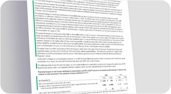 As the sensitivity to a 50 basis point change in interest rates includes any associated change in the applicable reinvestment scenarios, the impact of changes to interest rates for less than, or more than 50 basis points is unlikely to be linear. Furthermore, our sensitivities are not consistent across all regions in which we operate, and the impact of yield curve changes will vary depending upon the geography where the change occurs. Reinvestment assumptions used in the valuation of policy liabilities tend to amplify the negative effects of a decrease in interest rates and dampen the positive effects of interest rate increases. This is because the reinvestment assumptions used in the valuation of our insurance liabilities are based on interest rate scenarios and calibration criteria set by the ASB. Therefore, in any particular quarter, changes to the reinvestment assumptions are not fully aligned to changes in current market interest rates especially when there is a significant change in the shape of the interest rate curve. As a result, the impact from non-parallel movements may be materially different from the estimated impact of parallel movements. For example, if long-term interest rates increase more than short-term interest rates (sometimes referred to as a steepening of the yield curve) in North America, the decrease in the value of our swaps may be greater than the decrease in the value of our insurance liabilities. This could result in a charge to net income attributed to shareholders in the short-term even though the rising and steepening of the yield curve, if sustained, may have a positive long-term economic impact. The interest rate and spread risk sensitivities are determined in isolation of each other and therefore do not reflect the combined impact of changes in government rates and credit spreads between government, swap and corporate rates occurring simultaneously. As a result, the impact of the summation of each individual sensitivity may be materially different from the impact of sensitivities to simultaneous changes in interest rate and spread risk. The potential impact on net income attributed to shareholders does not take into account any future potential changes to our URR assumptions or calibration criteria for stochastic risk-free rates. In 2021, the ASB issued a new promulgation with reductions to the URR and updates to the calibration criteria for stochastic risk-free rates. The updated standard included a reduction of 15 basis points in the URR and a corresponding change to stochastic risk-free rate modeling and was effective October 15, 2021. At December 31, 2022, we estimated the sensitivity of our net income attributed to shareholders to a 10 basis point reduction in the URR in all geographies, and a corresponding change to stochastic risk-free modeling, to be a charge of $300 million (post-tax); and note that the impact of changes to the URR are not linear. The long-term URR for risk-free rates in Canada is prescribed at 2.9% and we use the same assumption for the U.S. Our assumption for Japan is 1.5%. The potential impact on net income attributable to shareholders does not take into account other potential impacts of lower interest rate levels, for example, increased strain on the sale of new business or lower interest earned on our surplus assets. The impact on net income attributed to shareholders also does not reflect any unrealized gains or losses on AFS fixed income assets held in our Corporate and Other segment. Changes in the market value of these assets may provide a natural economic offset to the interest rate risk arising from our product liabilities. In order for there to also be an accounting offset, the Company would need to realize a portion of the AFS fixed income asset unrealized gains or losses. It is not certain we would realize any of the unrealized gains or losses available. The impact does not reflect any potential effect of changing interest rates to the value of our ALDA assets. Rising interest rates could negatively impact the value of our ALDA (see “Critical Actuarial and Accounting Policies – Fair Value of Invested Assets”, below). More information on ALDA can be found under the section “Alternative Long-Duration Asset Performance Risk Sensitivities and Exposure Measures”, below. Under LICAT, changes in unrealized gains or losses in our AFS bond portfolio resulting from interest rate shocks tend to dominate capital sensitivities. As a result, the reduction in interest rates improves LICAT ratios and vice-versa. The following table shows the potential impact on net income attributed to shareholders as well as the change in the market value of AFS fixed income assets held in our Corporate and Other segment, which could be realized through the sale of these assets. Potential impact on net income attributed to shareholders and MLI’s LICAT ratio of an immediate parallel change in interest rates (1),(2),(3),(4) relative to rates assumed in the valuation of policy liabilities 2022 2021 As at December 31, -50bp +50bp -50bp +50bp Net income attributed to shareholders ($ millions) $ (100) $ 100 $ (200) $ nil Changes in other comprehensive income from fair value changes in AFS fixed income assets held in the Corporate and Other segment ($ millions) 1,500 (1,400) 2,100 (1,900) (5) MLI’s LICAT ratio (change in percentage points) 3(2)5 (4) (1) See “Caution Related to Sensitivities” above. In addition, estimates exclude changes to the net actuarial gains/losses with respect to the Company’s pension obligations as a result of changes in interest rates, as the impact on the quoted sensitivities is not considered to be material. (2) Includes guaranteed insurance and annuity products, including variable annuity contracts as well as adjustable benefit products where benefits are generally adjusted as interest rates and investment returns change, a portion of which have minimum credited rate guarantees. For adjustable benefit pr