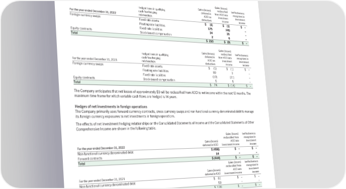 Cash flow hedges The Company uses interest rate swaps to hedge the variability in cash flows from variable rate financial instruments and forecasted transactions. The Company also uses cross currency swaps and foreign currency forward contracts to hedge the variability from foreign currency financial instruments and foreign currency expenses. Total return swaps are used to hedge the variability in cash flows associated with certain stock-based compensation awards. Inflation swaps are used to reduce inflation risk generated from inflation- indexed liabilities. The effects of derivatives in cash flow hedging relationships on the Consolidated Statements of Income and the Consolidated Statements of Comprehensive Income are shown in the following table. Gains (losses) Gains (losses) reclassified Ineffectiveness Hedged items in qualifying deferred in from AOCI into recognized in cash flow hedging AOCI on investment investment For the year ended December 31, 2022 relationships derivatives income income Foreign currency swaps Fixed rate assets $ (1) $ (1) $ – Floating rate liabilities 175 (49) – Fixed rate liabilities 34 35 – Equity contracts Stock-based compensation 2 6 – Total $ 210 $ (9) $ – Gains (losses) Gains (losses) reclassified Ineffectiveness Hedged items in qualifying deferred in from AOCI into recognized in cash flow hedging AOCI on investment investment For the year ended December 31, 2021 relationships derivatives income income Foreign currency swaps Fixed rate assets $ (1) $ (1) $ – Floating rate liabilities 89 3 – Fixed rate liabilities (19) (21) – Equity contracts Stock-based compensation 5 5 – Total $ 74 $ (14) $ – The Company anticipates that net losses of approximately $9 will be reclassified from AOCI to net income within the next 12 months. The maximum time frame for which variable cash flows are hedged is 14 years. Hedges of net investments in foreign operations The Company primarily uses forward currency contracts, cross currency swaps and non-functional currency denominated debt to manage its foreign currency exposures to net investments in foreign operations. The effects of net investment hedging relationships on the Consolidated Statements of Income and the Consolidated Statements of Other Comprehensive Income are shown in the following table. Gains (losses) Ineffectiveness reclassified from recognized in Gains (losses) AOCI into investment For the year ended December 31, 2022 deferred in AOCI investment income income Non-functional currency denominated debt $(458) $ – $ – Forward contracts 14 – – Total $(444) $ – $ – Gains (losses) Ineffectiveness reclassified from recognized in Gains (losses) AOCI into investment For the year ended December 31, 2021 deferred in AOCI investment income income Non-functional currency denominated debt $ 61 $ – $ – Forward contracts 59 – – Total $120 $– $– 172 | 2022AnnualReport | NotestoConsolidatedFinancialStatements