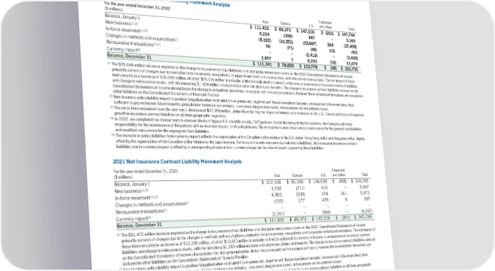 The impact of changes in actuarial methods and assumptions in Corporate and Other (which includes our Reinsurance business) resulted in a $5 million post-tax charge to net income attributed to shareholders. Change in net insurance contract liabilities The change in net insurance contract liabilities can be attributed to several sources: new business, acquisitions, in-force movement and currency impact. Changes in net insurance contract liabilities are substantially offset in the financial statements by premiums, investment income, policy benefits and other policy related cash flows. The changes in net insurance contract liabilities by business segment are shown below: 2022NetInsuranceContractLiabilityMovementAnalysis For the year ended December 31, 2022 Corporate ($ millions) Asia Canada U.S. and Other Total Balance, January 1 $ 111,432 $ 89,373 $ 147,230 $ (291) $ 347,744 (1),(2) New business 5,224 (306) 447 – 5,365 (1),(3) In-force movement (8,222) (10,353) (19,667) 284 (37,958) (1) Changes in methods and assumptions 50 (71) (46) (13) (80) (1),(4) Reinsurance transactions – – (2,419) – (2,419) (5) Currency impact 2,857 7 8,233 (18) 11,079 Balance, December 31 $ 111,341 $ 78,650 $ 133,778 $ (38) $ 323,731 (1) The $35,644 million decrease reported as the change in insurance contract liabilities and change in reinsurance assets on the 2022 Consolidated Statements of Income primarily consists of changes due to normal in-force movement, new policies, changes in methods and assumptions, and reinsurance transactions. The net impact of these items results in a decrease of $35,092 million, of which $36,116 million is included in the Consolidated Statements of Income as a decrease in insurance contract liabilities and change in reinsurance assets, with the remaining $1,024 million increase included in net claims and benefits. The change in insurance contract liabilities amount on the Consolidated Statements of Income also includes the change in embedded derivatives associated with insurance contracts, however these embedded derivatives are included in other liabilities on the Consolidated Statements of Financial Position. (2) New business policy liability impact is positive/(negative) when estimated future premiums, together with future investment income, are expected to be more/(less) than sufficient to pay estimated future benefits, policyholder dividends and refunds, taxes (excluding income taxes) and expenses on new policies issued. (3) The net in-force movement over the year was a decrease of $37,958 million, primarily reflecting the impact of interest rate increases in the U.S., Canada and Asia and expected growth in insurance contract liabilities in all three geographic segments. (4) In 2022, we completed two transactions to reinsure blocks of legacy U.S. variable annuity (“VA”) policies. Under the terms of the transactions, the Company will retain responsibility for the maintenance of the policies with no intended impact to VA policyholders. The transactions were structured as coinsurance for the general fund liabilities and modified coinsurance for the segregated fund liabilities. (5) The increase in policy liabilities from currency impact reflects the depreciation of the Canadian dollar relative to the U.S. dollar, Hong Kong dollar and Singapore dollar, slightly offset by the appreciation of the Canadian dollar relative to the Japanese yen. To the extent assets are currency matched to liabilities, the increase in insurance contract liabilities due to currency impact is offset by a corresponding increase from currency impact in the value of assets supporting those liabilities. 2021NetInsuranceContractLiabilityMovementAnalysis For the year ended December 31, 2021 Corporate ($ millions) Asia Canada U.S. and Other Total Balance, January 1 $ 102,958 $ 90,346 $ 146,939 $ (458) $ 339,785 (1),(2) New business 5,748 (211) 410 – 5,947 (1),(3) In-force movement 6,402 (939) 348 161 5,972 (1) Changes in methods and assumptions (335) 177 439 6 287 (1) Reinsurance transactions – – – – – (4) Currency impact (3,341) – (906) – (4,247) Balance, December 31 $ 111,432 $ 89,373 $ 147,230 $ (291) $ 347,744 (1) The $11,473 million increase reported as the change in insurance contract liabilities and change in reinsurance assets on the 2021 Consolidated Statements of Income primarily consists of changes due to the changes in methods and assumptions, normal in-force movement, new policies and associated embedded derivatives. The net impact of these items resulted in an increase of $12,206 million, of which $10,923 million is included in the Consolidated Statements of Income as an increase in insurance contract liabilities and change in reinsurance assets, with the remaining $1,283 million increase included in net claims and benefits. The change in insurance contract liabilities amount on the Consolidated Statements of Income also includes the change in embedded derivatives associated with insurance contracts, however these embedded derivatives are included in other liabilities on the Consolidated Statements of Financial Position. (2) New business policy liability impact is positive/(negative) when estimated future premiums, together with future investment income, are expected to be more/(less) than sufficient to pay estimated future benefits, policyholder dividends and refunds, taxes (excluding income taxes) and expenses on new policies issued. (3) The net in-force movement over the year was an increase of $5,972 million, primarily reflecting the expected growth in insurance contract liabilities in all three geographic segments, partially offset by the impact of interest rate increases. (4) The decrease in policy liabilities from currency impact reflects the appreciation of the Canadian dollar relative to the Japanese yen and U.S. dollar. To the extent assets are currency matched to liabilities, the decrease in insurance contract liabilities due to currency impact is offset by a corr