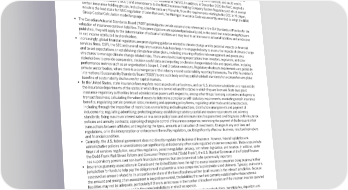 The impact of the frameworks on capital and other regulatory requirements and Manulife’s competitive position remains unknown and is being monitored. The Holistic Framework for the assessment and mitigation of systemic risk in the insurance sector was adopted by the Financial Stability Board (“FSB”) in December 2022 and the annual identification process of some IAIGs as Globally Systemically Important Insurers (“G-SIIs”), which had been paused since 2019, has been discontinued. See “Emerging Risks – Regulatory Capital” section below. • The National Association of Insurance Commissioners (“NAIC”) has been reviewing reserving and capital methodologies as well as the overall risk management framework. These reviews will affect U.S. life insurers, including John Hancock, and could lead to increased reserving and/or capital requirements for our business in the U.S. In addition, in December 2020 the NAIC adopted a group capital calculation (“GCC”) and amendments to the NAIC Insurance Holding Company System Regulatory Act which exempt certain insurance holding groups, including John Hancock and Manulife, from the requirements relating to the GCC. In Michigan, which is the lead state for NAIC regulation of John Hancock, the Michigan Insurance Code was recently amended to adopt the NAIC Group Capital Calculation model language. • The Canadian Actuarial Standards Board (“ASB”) promulgates certain assumptions referenced in the CIA Standards of Practice for the valuation of insurance contract liabilities. These promulgations are updated periodically and, in the event that new promulgations are published, they will apply to the determination of actuarial liabilities and may lead to an increase in actuarial liabilities and a reduction in net income attributed to shareholders. • Increasingly, global financial regulators are promulgating guidance related to climate change and its potential impacts on financial services firms. OSFI, the SEC and several regulators across Asia have begun to engage industry to assess the impacts of climate change and to set expectations on establishing climate transition plans, including ensuring effective risk management and governance structures to manage climate change-related risks. There are also increasing expectations from investors, regulators, and other stakeholders to provide comparable, decision-useful data and reporting on climate change-related risks and opportunities, including performance metrics such as an organization’s Scope 1, 2 and 3 carbon emissions. Regulatory disclosure requirements are guided by private sector bodies, where there is a convergence in the industry around sustainability reporting frameworks. The IFRS Foundation’s International Sustainability Standards Board (“ISSB”) is one such body and has published draft standards for a comprehensive global baseline of sustainability disclosures for capital markets. • In the United States, state insurance laws regulate most aspects of our business, and our U.S. insurance subsidiaries are regulated by the insurance departments of the states in which they are domiciled and the states in which they are licensed. State laws grant insurance regulatory authorities broad administrative powers with respect to, among other things: licensing companies and agents to transact business; calculating the value of assets to determine compliance with statutory requirements; mandating certain insurance benefits; regulating certain premium rates; reviewing and approving policy forms; regulating unfair trade and claims practices, including through the imposition of restrictions on marketing and sales practices, distribution arrangements and payment of inducements; regulating advertising; protecting privacy; establishing statutory capital and reserve requirements and solvency standards; fixing maximum interest rates on insurance policy loans and minimum rates for guaranteed crediting rates on life insurance policies and annuity contracts; approving changes in control of insurance companies; restricting the payment of dividends and other transactions between affiliates; and regulating the types, amounts and valuation of investments. Changes in any such laws and regulations, or in the interpretation or enforcement thereof by regulators, could significantly affect our business, results of operations and financial condition. • Currently, the U.S. federal government does not directly regulate the business of insurance. However, federal legislation and administrative policies in several areas can significantly and adversely affect state regulated insurance companies. These areas include financial services regulation, securities regulation, pension regulation, privacy, tort reform legislation, and taxation. In addition, under the Dodd-Frank Wall Street Reform and Consumer Protection Act (“Dodd-Frank”), the U.S. Board of Governors of the Federal Reserve has supervisory powers over non-bank financial companies that are determined to be systemically important. • Insurance guaranty associations in Canada and the United States have the right to assess insurance companies doing business in their jurisdiction for funds to help pay the obligations of insolvent insurance companies to policyholders and claimants. Typically, an insurer is assessed an amount related to its proportionate share of the line of business written by all insurers in the relevant jurisdiction. Because the amount and timing of an assessment is beyond our control, the liabilities that we have currently established for these potential liabilities may not be adequate, particularly if there is an increase in the number of insolvent insurers or if the insolvent insurers operated in the same lines of business and in the same jurisdictions in which we operate. • While many of the laws and regulations to which we are subject are intended to protect policyholders, beneficiaries, depositors and investors in our products an
