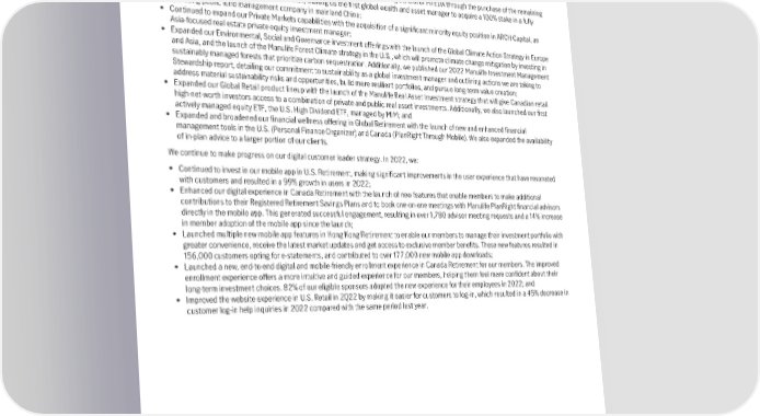 Strategic Highlights Leveraging our integrated business model and global scale, we have a clear strategy to pursue high-growth opportunities in the most attractive markets globally through our three business lines: Retirement, Retail and Institutional Asset Management. Our strategy includes being a global retirement leader by supporting financial wellness; expanding our presence in retail distribution platforms across the globe; leveraging a multi-manager model; and providing differentiated institutional active asset management capabilities across high performing equity and fixed income strategies, outcome-oriented solutions and alternative assets. We executed on a number of initiatives to accelerate growth in our franchise. In 2022, we: • Further bolstered our presence in high-growth attractive markets by acquiring control of MTEDA through the purchase of the remaining 51% of shares from our joint venture partner, making us the first global wealth and asset manager to acquire a 100% stake in a fully operating public fund management company in mainland China; • Continued to expand our Private Markets capabilities with the acquisition of a significant minority equity position in ARCH Capital, an Asia-focused real estate private equity investment manager; • Expanded our Environmental, Social and Governance investment offerings with the launch of the Global Climate Action Strategy in Europe and Asia, and the launch of the Manulife Forest Climate strategy in the U.S., which will promote climate change mitigation by investing in sustainably managed forests that prioritize carbon sequestration. Additionally, we published our 2022 Manulife Investment Management Stewardship report, detailing our commitment to sustainability as a global investment manager and outlining actions we are taking to address material sustainability risks and opportunities, build more resilient portfolios, and pursue long-term value creation; • Expanded our Global Retail product lineup with the launch of the Manulife Real Asset Investment strategy that will give Canadian retail high-net-worth investors access to a combination of private and public real asset investments. Additionally, we also launched our first actively managed equity ETF, the U.S. High Dividend ETF, managed by MIM; and • Expanded and broadened our financial wellness offering in Global Retirement with the launch of new and enhanced financial management tools in the U.S. (Personal Finance Organizer) and Canada (PlanRight Through Mobile). We also expanded the availability of in-plan advice to a larger portion of our clients. We continue to make progress on our digital customer leader strategy. In 2022, we: • Continued to invest in our mobile app in U.S. Retirement, making significant improvements in the user experience that have resonated with customers and resulted in a 99% growth in users in 2022; • Enhanced our digital experience in Canada Retirement with the launch of new features that enable members to make additional contributions to their Registered Retirement Savings Plans and to book one-on-one meetings with Manulife PlanRight financial advisors directly in the mobile app. This generated successful engagement, resulting in over 1,780 advisor meeting requests and a 14% increase in member adoption of the mobile app since the launch; • Launched multiple new mobile app features in Hong Kong Retirement to enable our members to manage their investment portfolio with greater convenience, receive the latest market updates and get access to exclusive member benefits. These new features resulted in 156,000 customers opting for e-statements, and contributed to over 177,000 new mobile app downloads; • Launched a new, end-to-end digital and mobile-friendly enrollment experience in Canada Retirement for our members. The improved enrollment experience offers a more intuitive and guided experience for our members, helping them feel more confident about their long-term investment choices. 82% of our eligible sponsors adopted the new experience for their employees in 2022; and • Improved the website experience in U.S. Retail in 2Q22 by making it easier for customers to log-in, which resulted in a 45% decrease in customer log-in help inquiries in 2022 compared with the same period last year. 35