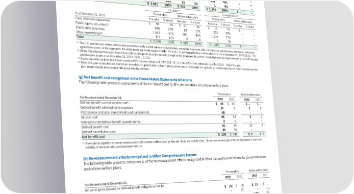 (f) Fair value measurements The following tables present major categories of plan assets and the allocation to each category. (1) (2) U.S. plans Canadian plans Pension plans Retiree welfare plans Pension plans Retiree welfare plans As at December 31, 2022 Fair value % of total Fair value % of total Fair value % of total Fair value % of total Cash and cash equivalents $ 35 1% $ 22 4% $ 9 1% $ – – (3) Public equity securities 377 15% 41 8% 233 20% – – Public debt securities 1,509 58% 445 85% 898 79% – – (4) Other investments 660 26% 15 3% 1 0% – – Total $ 2,581 100% $ 523 100% $ 1,141 100% $ – – (1) (2) U.S. plans Canadian plans Pension plans Retiree welfare plans Pension plans Retiree welfare plans As at December 31, 2021 Fair value % of total Fair value % of total Fair value % of total Fair value % of total Cash and cash equivalents $ 90 3% $ 21 4% $ 14 1% $ – – (3) Public equity securities 600 20% 57 10% 322 22% – – Public debt securities 1,863 61% 501 85% 1,144 77% – – (4) Other investments 475 16% 8 1% 2 0% – – Total $ 3,028 100% $ 587 100% $ 1,482 100% $ – – (1) The U.S. pension and retiree welfare plan assets have daily quoted prices in active markets, except for the private debt, infrastructure, private equity, real estate, timber and agriculture assets. In the aggregate, the latter assets represent approximately 15% of all U.S. pension and retiree welfare plan assets as at December 31, 2022 (2021 – 7%). (2) All the Canadian pension plan assets have daily quoted prices in active markets, except for the group annuity contract assets that represent approximately 0.1% of all Canadian pension plan assets as at December 31, 2022 (2021 – 0.1%). (3) Equity securities include direct investments in MFC common shares of $1.2 (2021 – $1.2) in the U.S. retiree welfare plan and $nil (2021 – $nil) in Canada. (4) Other U.S. plan assets include investment in real estate, private debt, infrastructure, private equity, timberland and agriculture, and managed futures. Other Canadian pension plan assets include investment in the group annuity contract. (g) NetbenefitcostrecognizedintheConsolidatedStatementsofIncome The following table presents components of the net benefit cost for the pension plans and retiree welfare plans. Pension plans Retiree welfare plans For the years ended December 31, 2022 2021 2022 2021 (1) Defined benefit current service cost $43$44 $– $– Defined benefit administrative expenses 11 9 2 2 Past service cost-plan amendments and curtailments (6) – – – Service cost 48 53 2 2 Interest on net defined benefit (asset) liability 2 6 – 1 Defined benefit cost 50 59 2 3 Defined contribution cost 85 90 – – Net benefit cost $ 135 $ 149 $2 $3 (1) There are no significant current service costs for the retiree welfare plans as they are closed and mostly frozen. The remeasurement gain or loss on these plans is due to the volatility of discount rates and investment returns. (h) Re-measurementeffectsrecognizedinOtherComprehensiveIncome The following table presents components of the re-measurement effects recognized in Other Comprehensive Income for the pension plans and retiree welfare plans. Pension plans Retiree welfare plans For the years ended December 31, 2022 2021 2022 2021 Actuarial gains (losses) on defined benefit obligations due to: Experience $(5)$ (3) $13 $– Demographic assumption changes – (7) – (1) Economic assumption changes 835 194 112 29 Return on plan assets (excluding interest income) (869) 70 (91) (1) Change in effect of asset limit (excluding interest) (10) (37) – – Total re-measurement effects $ (49) $ 217 $34 $27 203