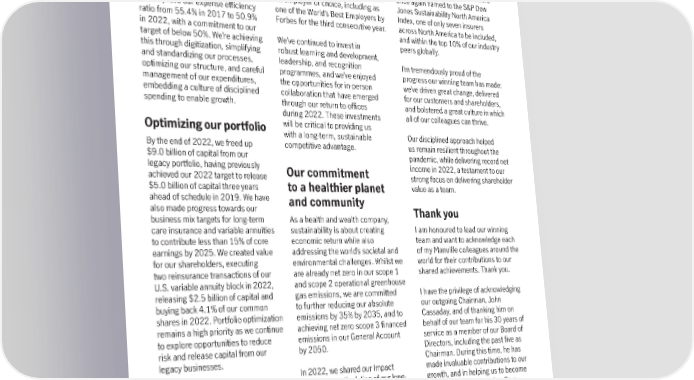 Driving expense top quartile employee engagement we will create long-term value for our efficiency scores in 2020, 2021, and 2022. business, our communities, and the Since 2017, we’ve seen continued planet. It’s how we all win. We continue to foster a culture of improvement each year, and in expense efficiency and prioritize our 2022, we ranked in the top six In recognition of our continued resources where they will be most percent amongst global finance and and strengthening commitment to effective. This focus has allowed insurance companies. In addition, we sustainability performance, we were us to contain the growth of our have been consistently recognized as once again named to the S&P Dow general expenses to less than 8% an employer of choice, including as Jones Sustainability North America and improve our expense efficiency one of the World’s Best Employers by Index, one of only seven insurers ratio from 55.4% in 2017 to 50.9% Forbes for the third consecutive year. across North America to be included, in 2022, with a commitment to our and within the top 10% of our industry target of below 50%. We’re achieving We’ve continued to invest in peers globally. this through digitization, simplifying robust learning and development, and standardizing our processes, leadership, and recognition I’m tremendously proud of the optimizing our structure, and careful programmes, and we’ve enjoyed progress our winning team has made: management of our expenditures, the opportunities for in-person we’ve driven great change, delivered embedding a culture of disciplined collaboration that have emerged for our customers and shareholders, spending to enable growth. through our return to offices and bolstered a great culture in which during 2022. These investments all of our colleagues can thrive. Optimizing our portfolio will be critical to providing us with a long-term, sustainable Our disciplined approach helped By the end of 2022, we freed up competitive advantage. us remain resilient throughout the $9.0 billion of capital from our pandemic, while delivering record net legacy portfolio, having previously Our commitment income in 2022, a testament to our achieved our 2022 target to release strong focus on delivering shareholder $5.0 billion of capital three years to a healthier planet value as a team. ahead of schedule in 2019. We have and community also made progress towards our Thank you business mix targets for long-term As a health and wealth company, care insurance and variable annuities sustainability is about creating I am honoured to lead our winning to contribute less than 15% of core economic return while also team and want to acknowledge each earnings by 2025. We created value addressing the world’s societal and of my Manulife colleagues around the for our shareholders, executing environmental challenges. Whilst we world for their contributions to our two reinsurance transactions of our are already net zero in our scope 1 shared achievements. Thank you. U.S. variable annuity block in 2022, and scope 2 operational greenhouse releasing $2.5 billion of capital and gas emissions, we are committed I have the privilege of acknowledging buying back 4.1% of our common to further reducing our absolute our outgoing Chairman, John shares in 2022. Portfolio optimization emissions by 35% by 2035, and to Cassaday, and of thanking him on remains a high priority as we continue achieving net zero scope 3 financed behalf of our team for his 30 years of to explore opportunities to reduce emissions in our General Account service as a member of our Board of risk and release capital from our by 2050. Directors, including the past five as legacy businesses. Chairman. During this time, he has In 2022, we shared our Impact made invaluable contributions to our Our winning team Agenda, an articulation of our long- growth, and in helping us to become and culture standing commitment to empowering the Company we are today. On a health and wellbeing, driving personal note, I have appreciated his None of this would be possible inclusive economic opportunities, support and wise counsel throughout without the efforts and dedication and accelerating a sustainable my tenure. Thank you, John. of our high-performing team, and future. Staying true to our Mission I’m very pleased that we achieved through our Impact Agenda is how 6 | 2022 Annual Report