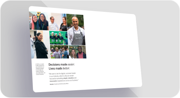 In 2022, we created Decisions made easier. in-office experiences and activities for our colleagues globally Lives made beter. to encourage and nurture connection and collaboration, and “ We want to be the digital, customer leader to drive innovation. in our industry, which is why we remain focused on providing simple, intuitive and innovative experiences across our business.” Roy Gori, President and Chief Executive Officer Cover.indd Cover.indd 22 2023-03-09 2023-03-09 11:59 PM11:59 PM
