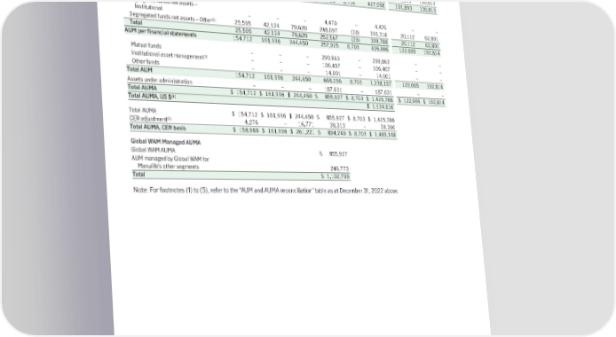 CAD $ US $(4) December 31, 2021 December 31, 2021 Global Corporate Asat Asia Canada U.S. WAM and Other Total Asia U.S. Total Invested Assets Manulife Bank net lending assets $ – $ 23,447 $ – $ – $ – $ 23,447 $ – $ – (1) Derivative reclassification – – – – (7,475) (7,475) – – Invested assets excluding above items 129,207 96,425 164,830 4,458 16,206 411,126 101,893 130,013 Total 129,207 119,872 164,830 4,458 8,731 427,098 101,893 130,013 Segregated funds net assets Segregated funds net assets – Institutional – – – 4,470 – 4,470 – – (2) Segregated funds net assets – Other 25,505 42,124 79,620 248,097 (28) 395,318 20,112 62,801 Total 25,505 42,124 79,620 252,567 (28) 399,788 20,112 62,801 AUM per financial statements 154,712 161,996 244,450 257,025 8,703 826,886 122,005 192,814 Mutual funds – – – 290,863 – 290,863 – – (3) Institutional asset management – – – 106,407 – 106,407 – – Other funds – – – 14,001 – 14,001 – – Total AUM 154,712 161,996 244,450 668,296 8,703 1,238,157 122,005 192,814 Assets under administration – – – 187,631 – 187,631 – – Total AUMA $ 154,712 $ 161,996 $ 244,450 $ 855,927 $ 8,703 $ 1,425,788 $ 122,005 $ 192,814 (4) Total AUMA, US $ $ 1,124,616 Total AUMA $ 154,712 $ 161,996 $ 244,450 $ 855,927 $ 8,703 $ 1,425,788 (5) CER adjustment 4,276 – 16,771 38,313 – 59,360 Total AUMA, CER basis $ 158,988 $ 161,996 $ 261,221 $ 894,240 $ 8,703 $ 1,485,148 Global WAM Managed AUMA Global WAM AUMA $ 855,927 AUM managed by Global WAM for Manulife’s other segments 246,773 Total $ 1,102,700 Note: For footnotes (1) to (5), refer to the “AUM and AUMA reconciliation” table as at December 31, 2022 above. 122 | 2022AnnualReport | Management’sDiscussionandAnalysis