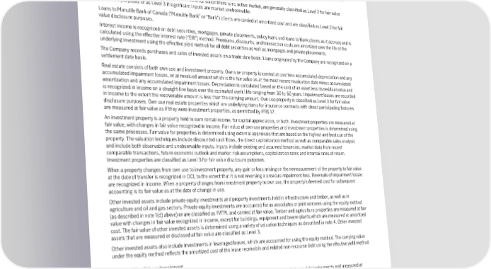 recorded in OCI and are never reclassified to investment income. Upon sale of an FVOCI equity security, related AOCI is reclassified to retained earnings. The Company’s risk management policies and procedures related to equities can be found in the denoted components of the “Risk Management and Risk Factors” section of the MD&A. Mortgages are classified as Level 3 for fair value purposes due to the lack of market observability of certain significant valuation inputs. The Company accounts for insured and uninsured mortgage securitizations as secured financing transactions since the criteria for sale accounting are not met. For these transactions, the Company continues to recognize the mortgages and records a liability in other liabilities for the amounts owed at maturity. Interest income from these mortgages and interest expense on the borrowings are recorded using the effective interest rate method. Private placements, which include corporate loans for which there is no active market, are generally classified as Level 2 for fair value disclosure purposes or as Level 3 if significant inputs are market unobservable. Loans to Manulife Bank of Canada (“Manulife Bank” or “Bank”) clients are carried at amortized cost and are classified as Level 2 for fair value disclosure purposes. Interest income is recognized on debt securities, mortgages, private placements, policy loans and loans to Bank clients as it accrues and is calculated using the effective interest rate (“EIR”) method. Premiums, discounts, and transaction costs are amortized over the life of the underlying investment using the effective yield method for all debt securities as well as mortgages and private placements. The Company records purchases and sales of invested assets on a trade date basis. Loans originated by the Company are recognized on a settlement date basis. Real estate consists of both own use and investment property. Own use property is carried at cost less accumulated depreciation and any accumulated impairment losses, or at revalued amount which is the fair value as at the most recent revaluation date minus accumulated amortization and any accumulated impairment losses. Depreciation is calculated based on the cost of an asset less its residual value and is recognized in income on a straight-line basis over the estimated useful life ranging from 30 to 60 years. Impairment losses are recorded in income to the extent the recoverable amount is less than the carrying amount. Own use property is classified as Level 3 for fair value disclosure purposes. Own use real estate properties which are underlying items for insurance contracts with direct participating features are measured at fair value as if they were investment properties, as permitted by IFRS 17. An investment property is a property held to earn rental income, for capital appreciation, or both. Investment properties are measured at fair value, with changes in fair value recognized in income. Fair value of own use properties and investment properties is determined using the same processes. Fair value for properties is determined using external appraisals that are based on the highest and best use of the property. The valuation techniques include discounted cash flows, the direct capitalization method as well as comparable sales analysis and include both observable and unobservable inputs. Inputs include existing and assumed tenancies, market data from recent comparable transactions, future economic outlook and market risk assumptions, capitalization rates and internal rates of return. Investment properties are classified as Level 3 for fair value disclosure purposes. When a property changes from own use to investment property, any gain or loss arising on the remeasurement of the property to fair value at the date of transfer is recognized in OCI, to the extent that it is not reversing a previous impairment loss. Reversals of impairment losses are recognized in income. When a property changes from investment property to own use, the property’s deemed cost for subsequent accounting is its fair value as at the date of change in use. Other invested assets include private equity investments and property investments held in infrastructure and timber, as well as in agriculture and oil and gas sectors. Private equity investments are accounted for as associates or joint ventures using the equity method (as described in note 1(d) above) or are classified as FVTPL and carried at fair value. Timber and agriculture properties are measured at fair value with changes in fair value recognized in income, except for buildings, equipment and bearer plants which are measured at amortized cost. The fair value of other invested assets is determined using a variety of valuation techniques as described in note 4. Other invested assets that are measured or disclosed at fair value are classified as Level 3. Other invested assets also include investments in leveraged leases, which are accounted for using the equity method. The carrying value under the equity method reflects the amortized cost of the lease receivable and related non-recourse debt using the effective yield method. ExpectedCreditLossImpairment The expected credit loss (“ECL”) impairment allowance model applies to invested assets which are debt instruments and measured at FVOCI or amortized cost. ECL allowances are measured under four probability-weighted macroeconomic scenarios, which measure the difference between all contractual cash flows that are due to the Company in accordance with the contract and all the cash flows that the Company expects to receive, discounted at the original EIR. This process includes consideration of past events, current market conditions and reasonable supportable information about future economic conditions. Forward-looking macroeconomic variables used within the estimation models represent variables that are the most closely related with credit losses in the relevant por
