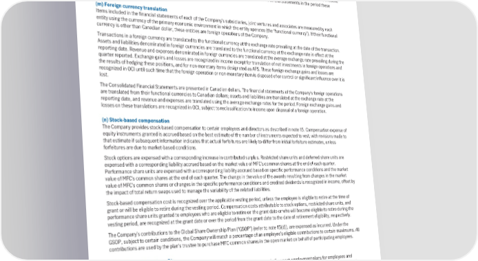 The Company is subject to income tax laws in various jurisdictions. Tax laws are complex and potentially subject to different interpretations by the taxpayer and the relevant tax authority. The provision for current income taxes and deferred income taxes represents management’s interpretation of the relevant tax laws and its estimate of current and future income tax implications of the transactions and events during the year. The Company may be required to change its provision for income taxes or deferred income tax balances when the ultimate deductibility of certain items is successfully challenged by taxing authorities, or if estimates used in determining the amount of deferred tax balances to recognize change significantly, or when receipt of new information indicates the need for adjustment in the amount of deferred income taxes to be recognized. Additionally, future events, such as changes in tax laws, tax regulations, or interpretations of such laws or regulations, could have an impact on the provision for income taxes, deferred tax balances and the effective tax rate. Any such changes could materially affect the amounts reported in the Consolidated Financial Statements in the period these changes occur. (m)Foreigncurrencytranslation Items included in the financial statements of each of the Company’s subsidiaries, joint ventures and associates are measured by each entity using the currency of the primary economic environment in which the entity operates (the “functional currency”). If their functional currency is other than Canadian dollar, these entities are foreign operations of the Company. Transactions in a foreign currency are translated to the functional currency at the exchange rate prevailing at the date of the transaction. Assets and liabilities denominated in foreign currencies are translated to the functional currency at the exchange rate in effect at the reporting date. Revenue and expenses denominated in foreign currencies are translated at the average exchange rate prevailing during the quarter reported. Exchange gains and losses are recognized in income except for translation of net investments in foreign operations and the results of hedging these positions, and for non-monetary items designated as AFS. These foreign exchange gains and losses are recognized in OCI until such time that the foreign operation or non-monetary item is disposed of or control or significant influence over it is lost. The Consolidated Financial Statements are presented in Canadian dollars. The financial statements of the Company’s foreign operations are translated from their functional currencies to Canadian dollars; assets and liabilities are translated at the exchange rate at the reporting date, and revenue and expenses are translated using the average exchange rates for the period. Foreign exchange gains and losses on these translations are recognized in OCI, subject to reclassification to income upon disposal of a foreign operation. (n) Stock-basedcompensation The Company provides stock-based compensation to certain employees and directors as described in note 15. Compensation expense of equity instruments granted is accrued based on the best estimate of the number of instruments expected to vest, with revisions made to that estimate if subsequent information indicates that actual forfeitures are likely to differ from initial forfeiture estimates, unless forfeitures are due to market-based conditions. Stock options are expensed with a corresponding increase in contributed surplus. Restricted share units and deferred share units are expensed with a corresponding liability accrued based on the market value of MFC’s common shares at the end of each quarter. Performance share units are expensed with a corresponding liability accrued based on specific performance conditions and the market value of MFC’s common shares at the end of each quarter. The change in the value of the awards resulting from changes in the market value of MFC’s common shares or changes in the specific performance conditions and credited dividends is recognized in income, offset by the impact of total return swaps used to manage the variability of the related liabilities. Stock-based compensation cost is recognized over the applicable vesting period, unless the employee is eligible to retire at the time of grant or will be eligible to retire during the vesting period. Compensation costs attributable to stock options, restricted share units, and performance share units granted to employees who are eligible to retire on the grant date or who will become eligible to retire during the vesting period, are recognized at the grant date or over the period from the grant date to the date of retirement eligibility, respectively. The Company’s contributions to the Global Share Ownership Plan (“GSOP”) (refer to note 15(d)), are expensed as incurred. Under the GSOP, subject to certain conditions, the Company will match a percentage of an employee’s eligible contributions to certain maximums. All contributions are used by the plan’s trustee to purchase MFC common shares in the open market on behalf of participating employees. (o) Employeefuturebenefits The Company maintains defined contribution and defined benefit pension plans and other post-employment plans for employees and agents including registered (tax qualified) pension plans that are typically funded as well as supplemental non-registered (non-qualified) pension plans for executives, retiree and disability welfare plans that are typically not funded. The Company’s obligation in respect of defined benefit pension and other post-employment benefits is calculated for each plan as the estimated present value of future benefits that eligible employees have earned in return for their service up to the reporting date using the projected benefit method. The discount rate used is based on the yield, as at the reporting date, of high-quality corporate debt s